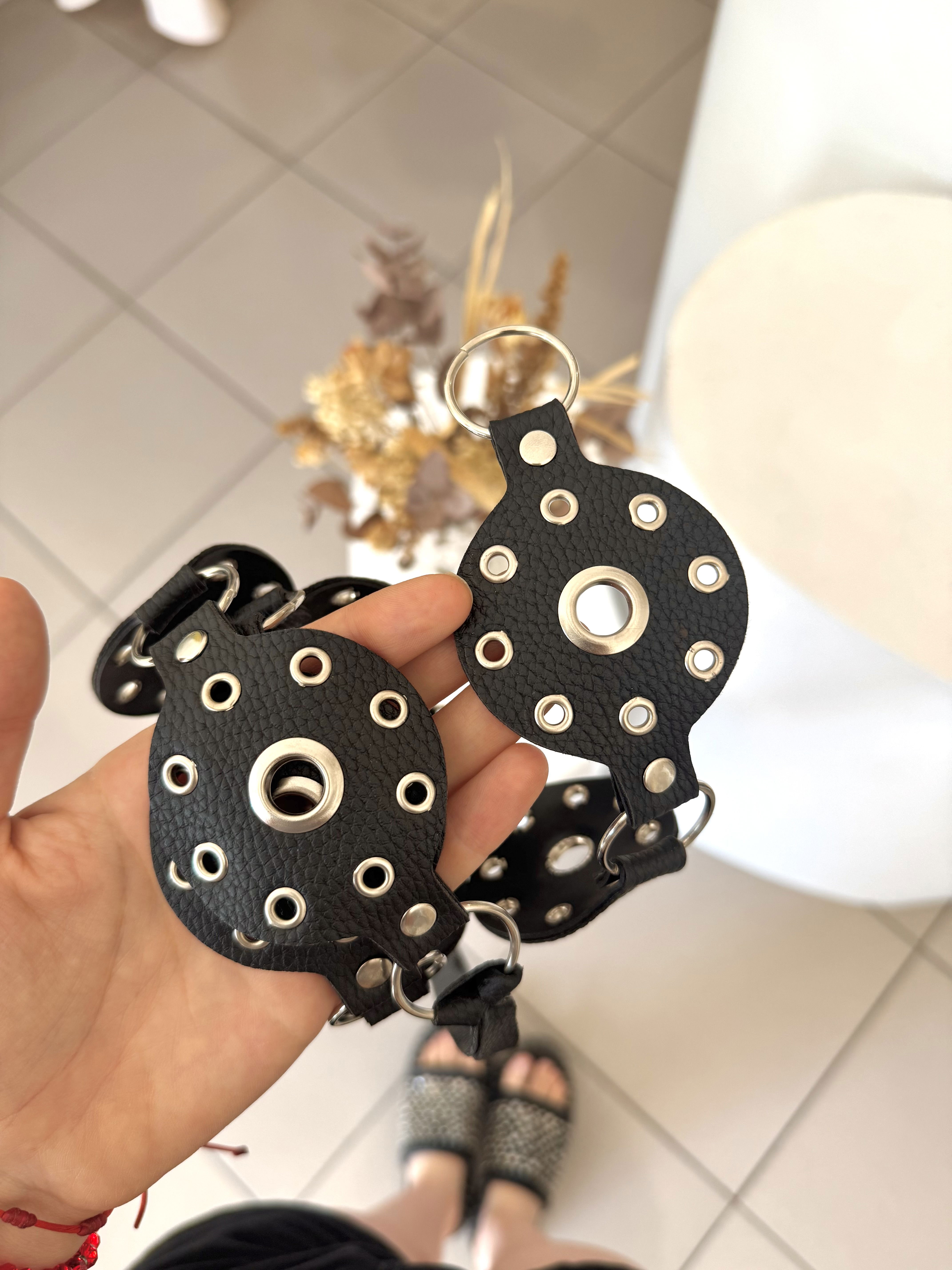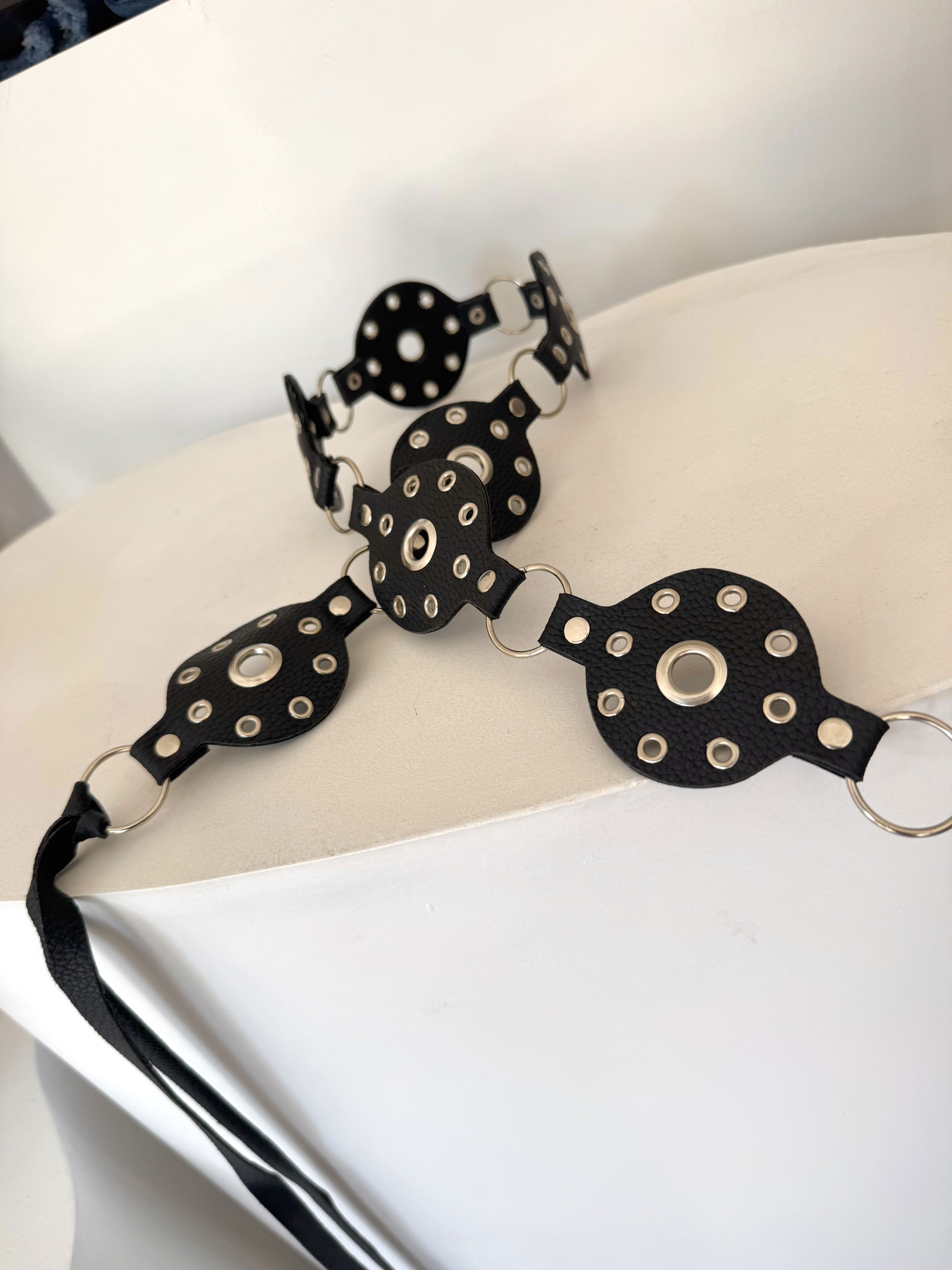 • Cinto tipo caderín con tachas y argollas. El largo es regulable ya que en la punta tiene cintas para atarlo en el largo que gustes.