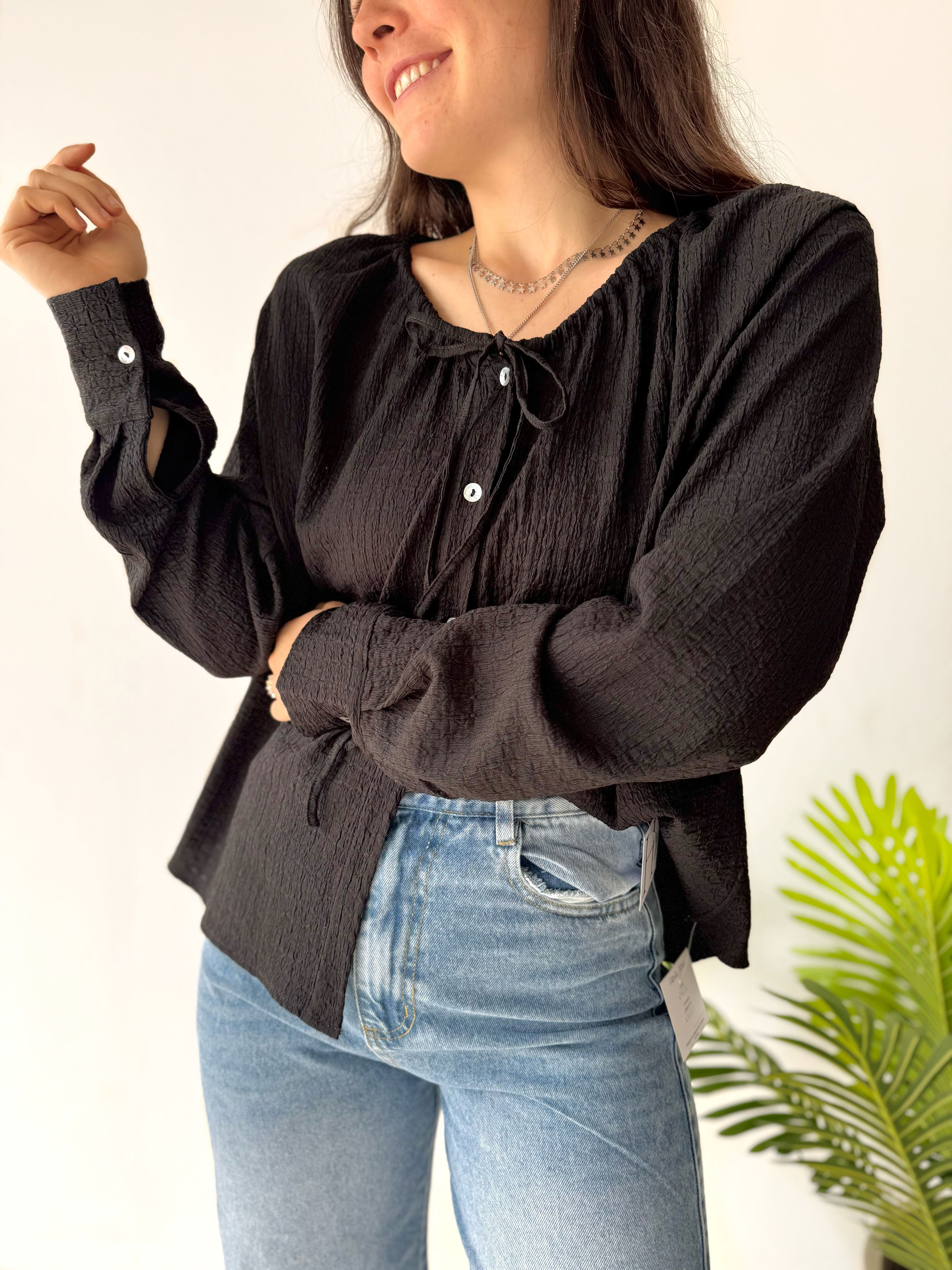 - Camisa de bambula, con botones carey y cuello regulable. Es una prenda que aporta delicadeza, es muy versátil e ideal para media estación.