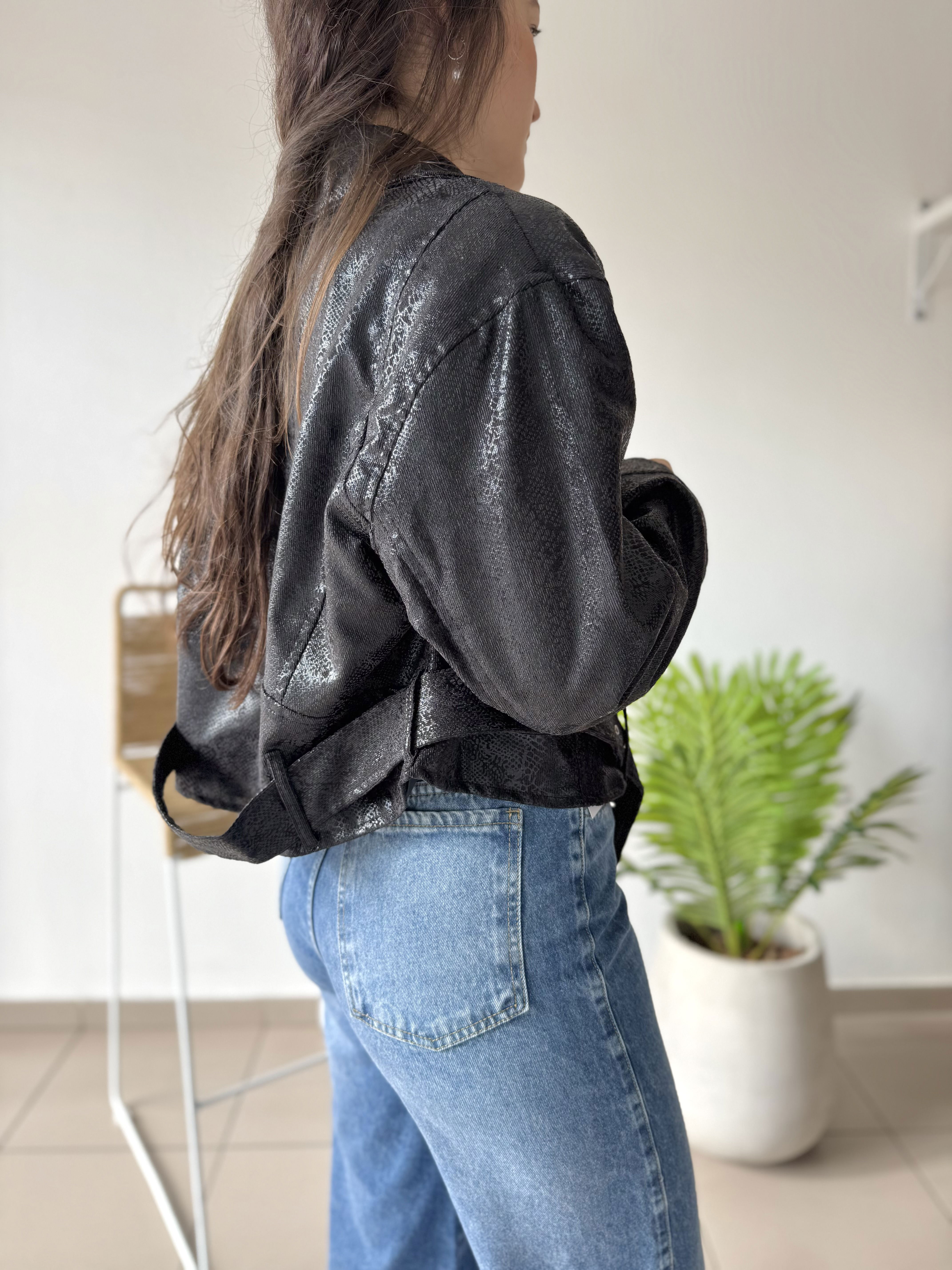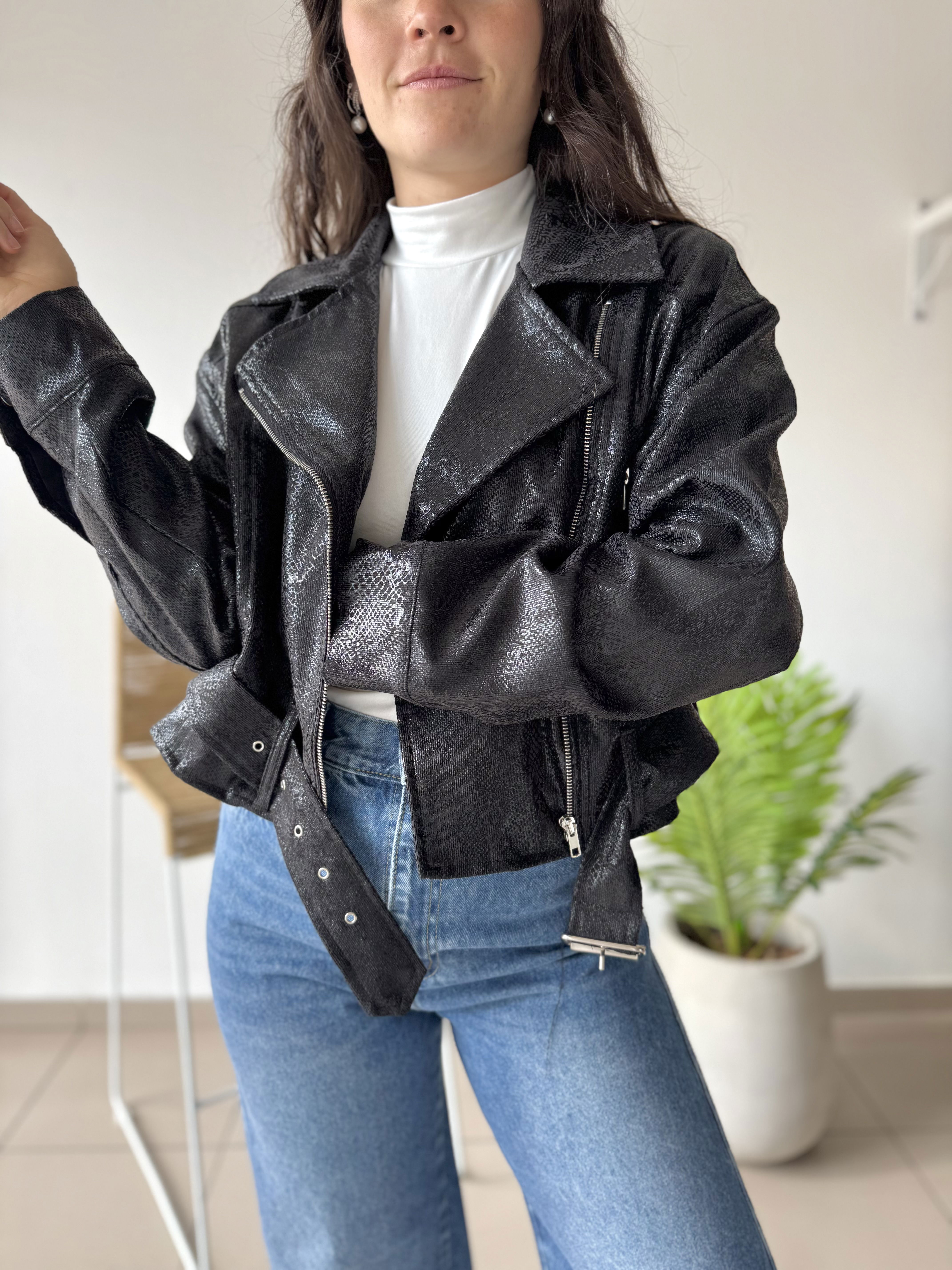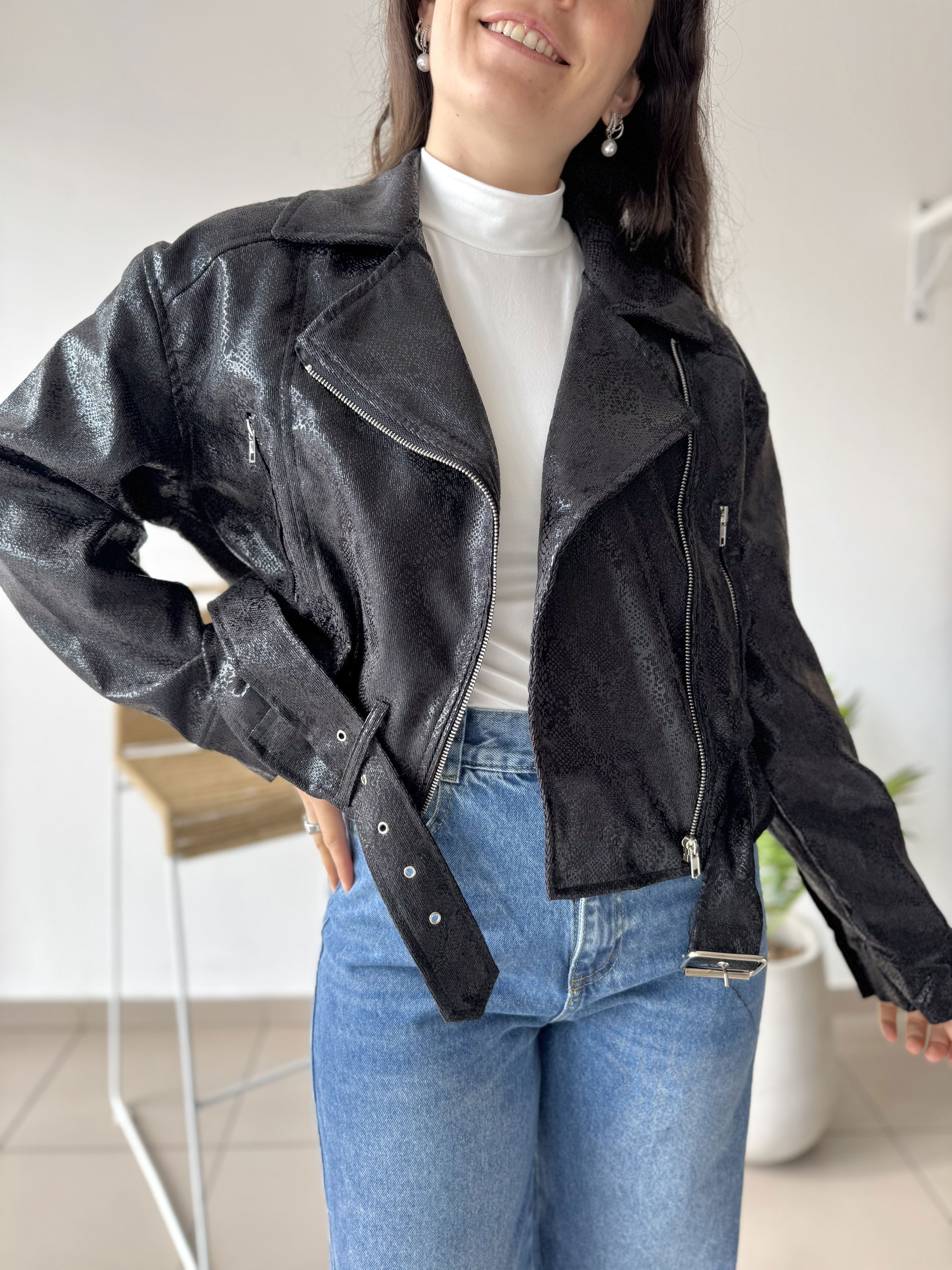 - Campera te dela reptil, forrada en su interior. Tiene cierre metálico en los puños, en los bolsillos laterales y en el frente, además este último es cruzado.