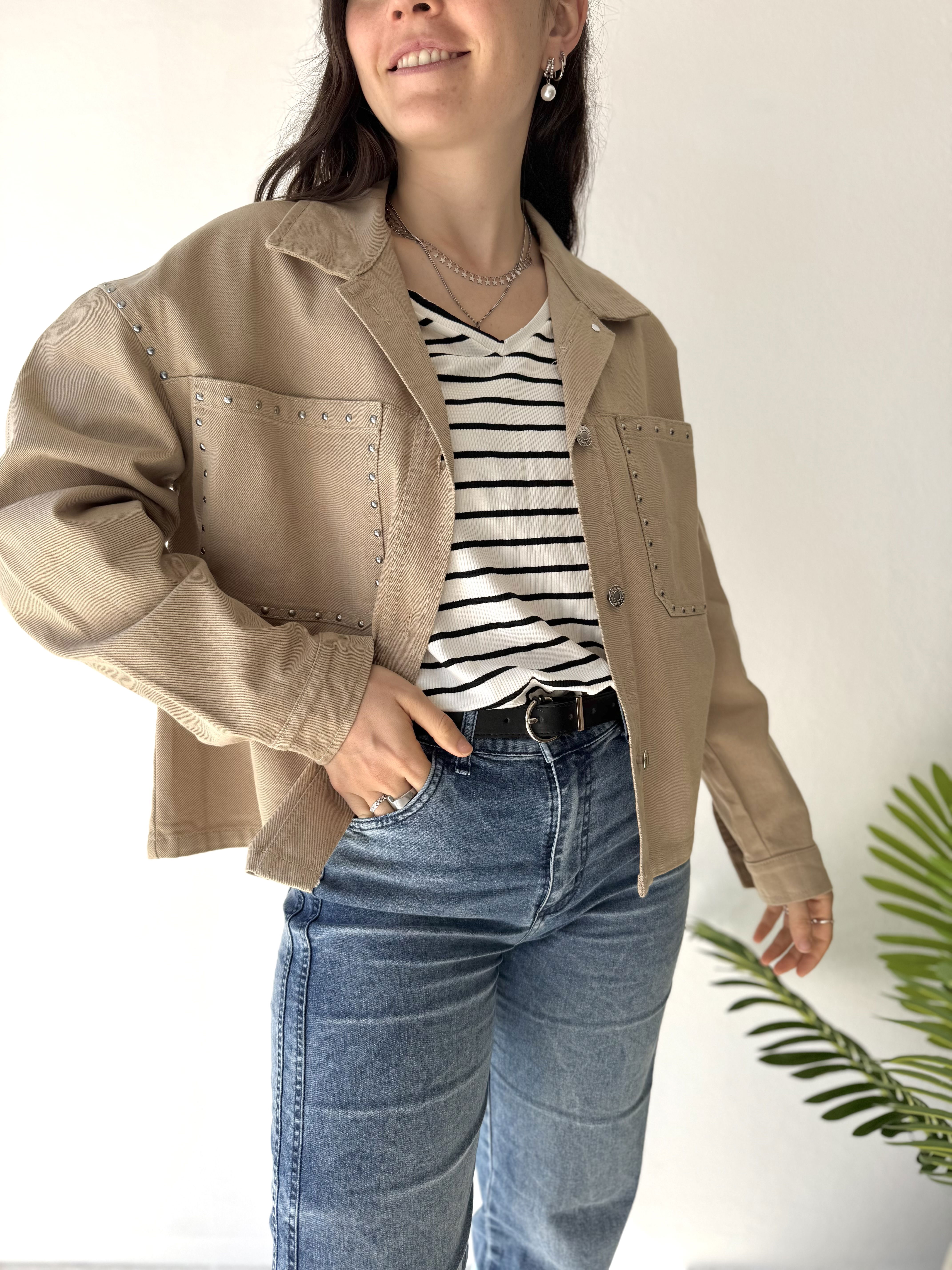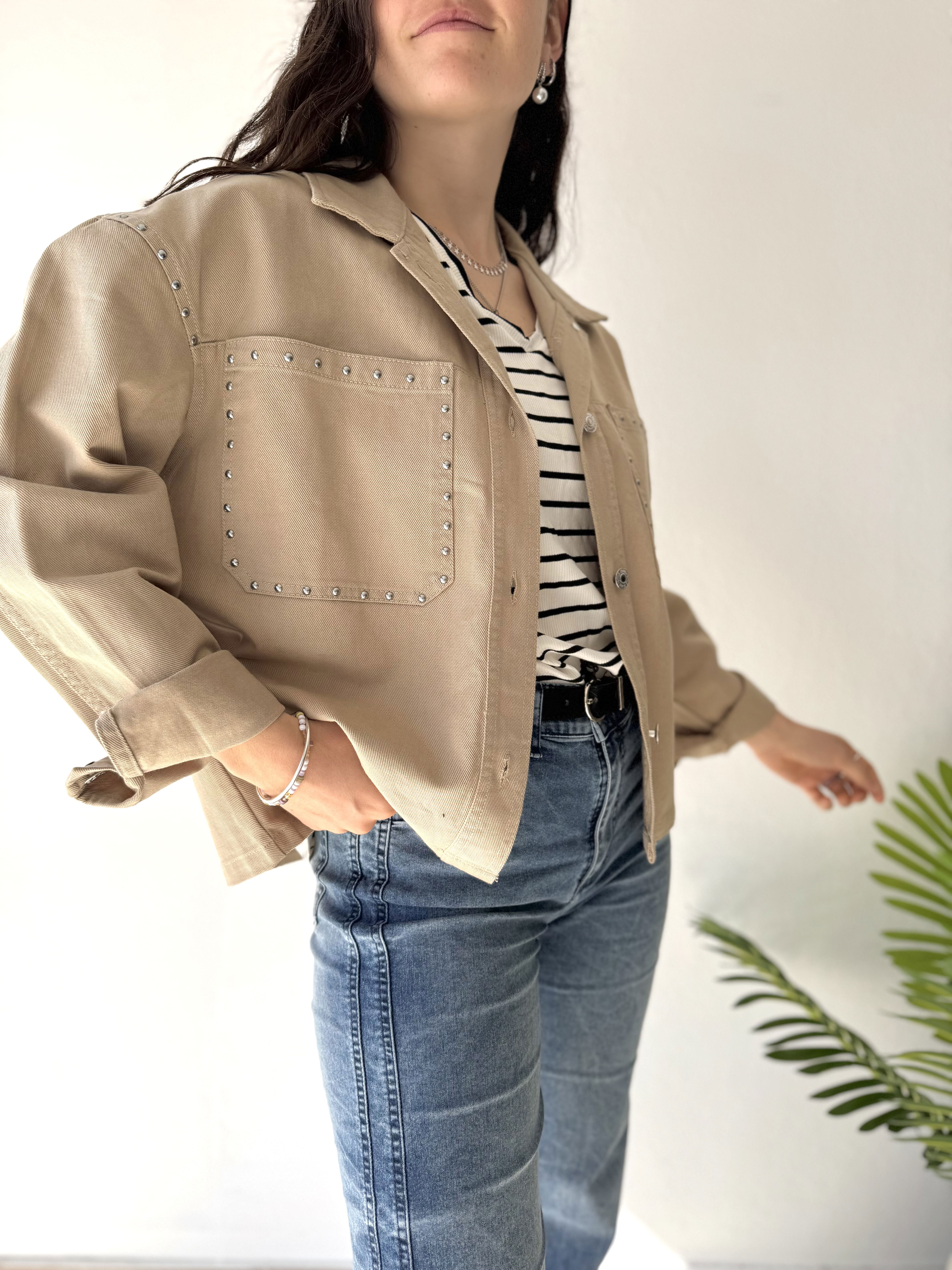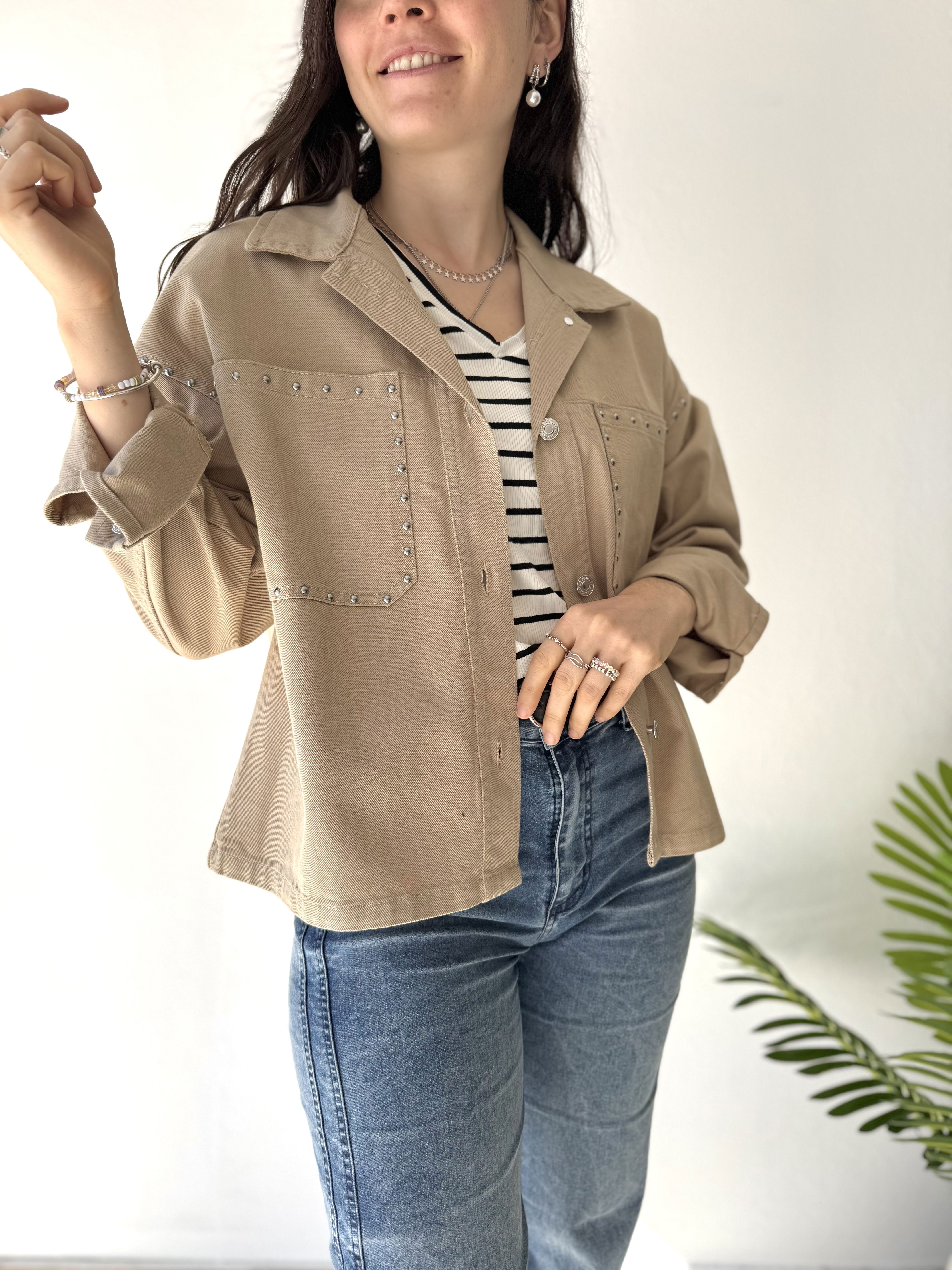 - Camisaco de gabardina rígida, con detalle de tachas en bolsillos delanteroS.