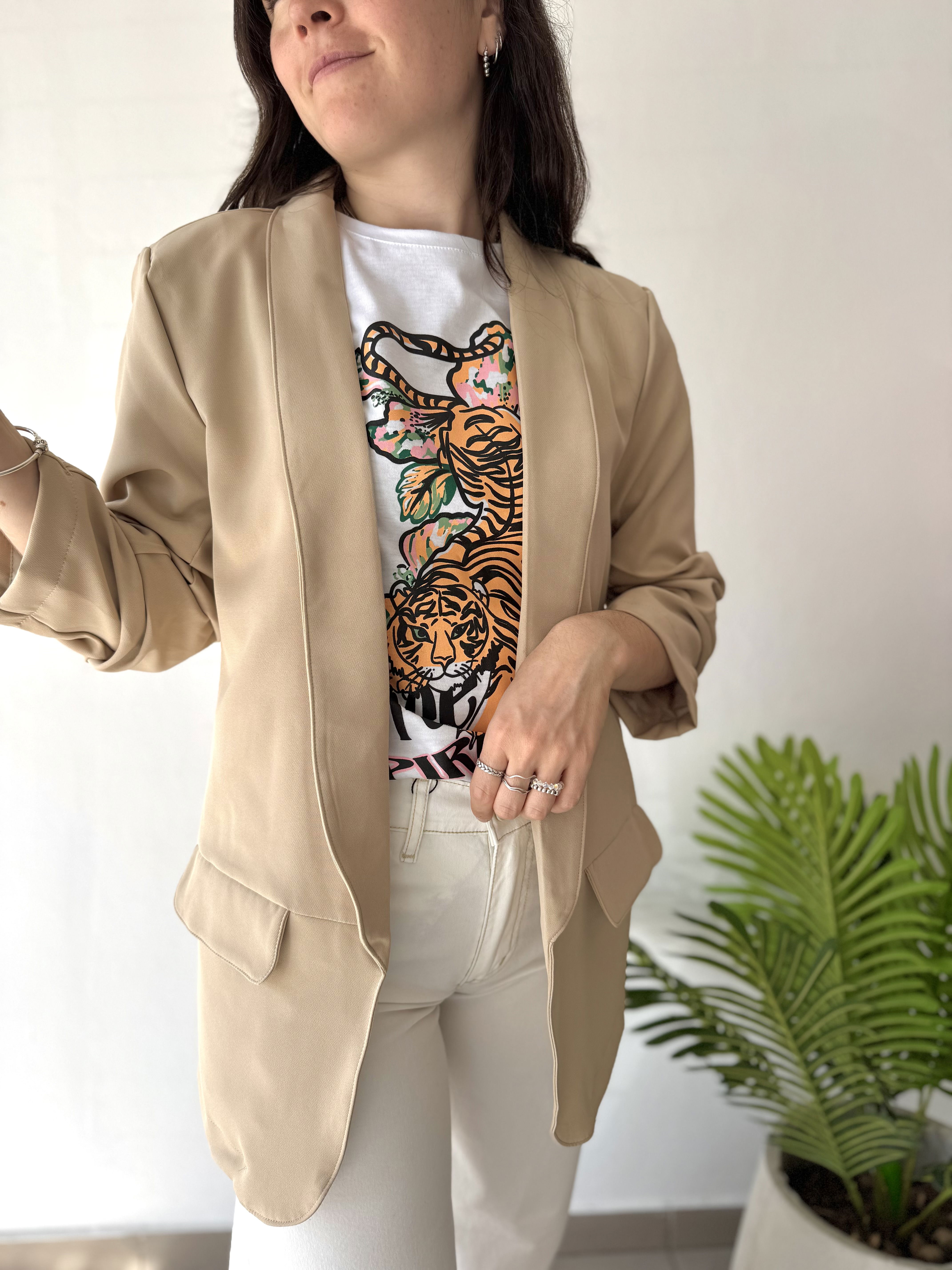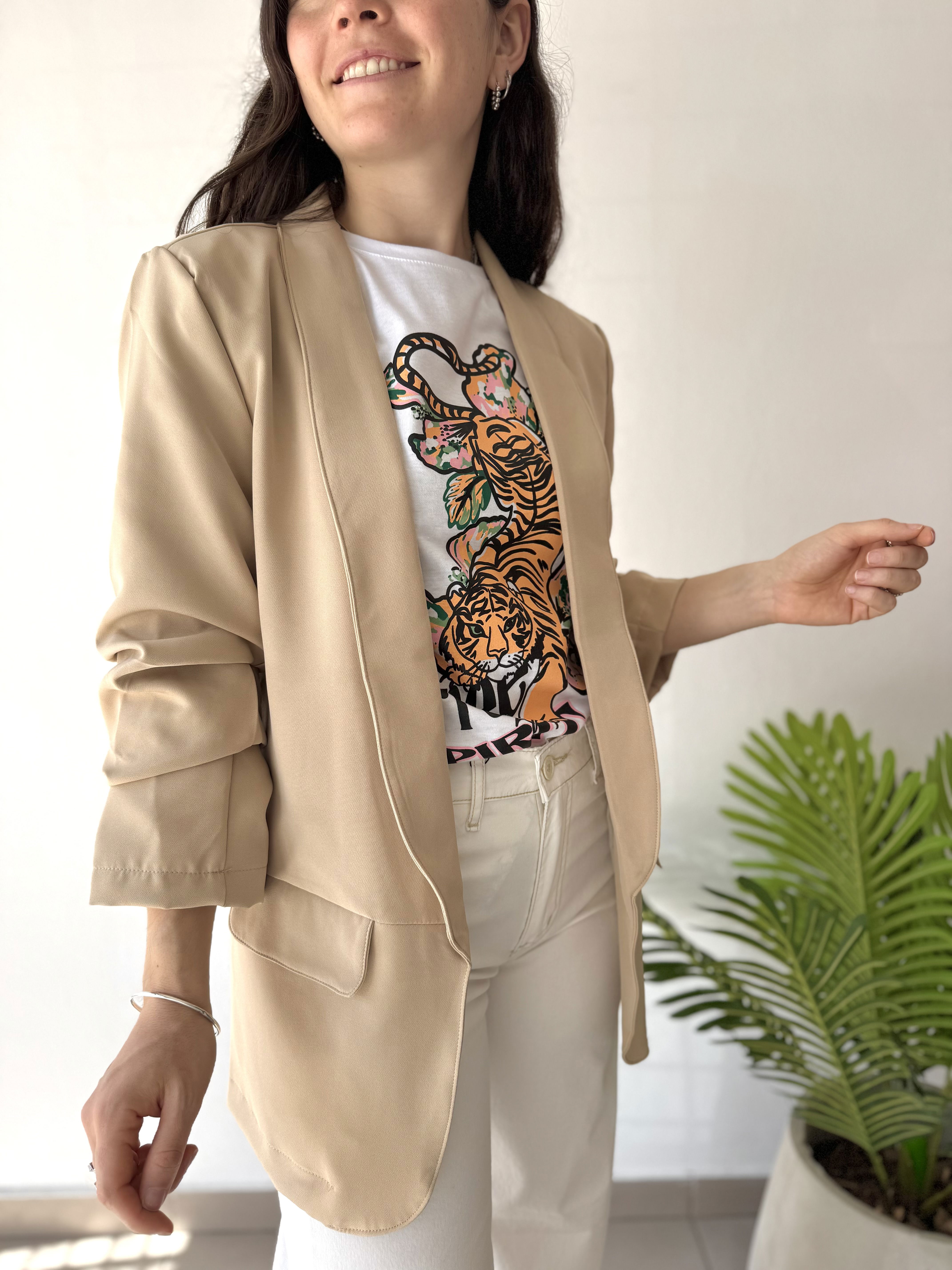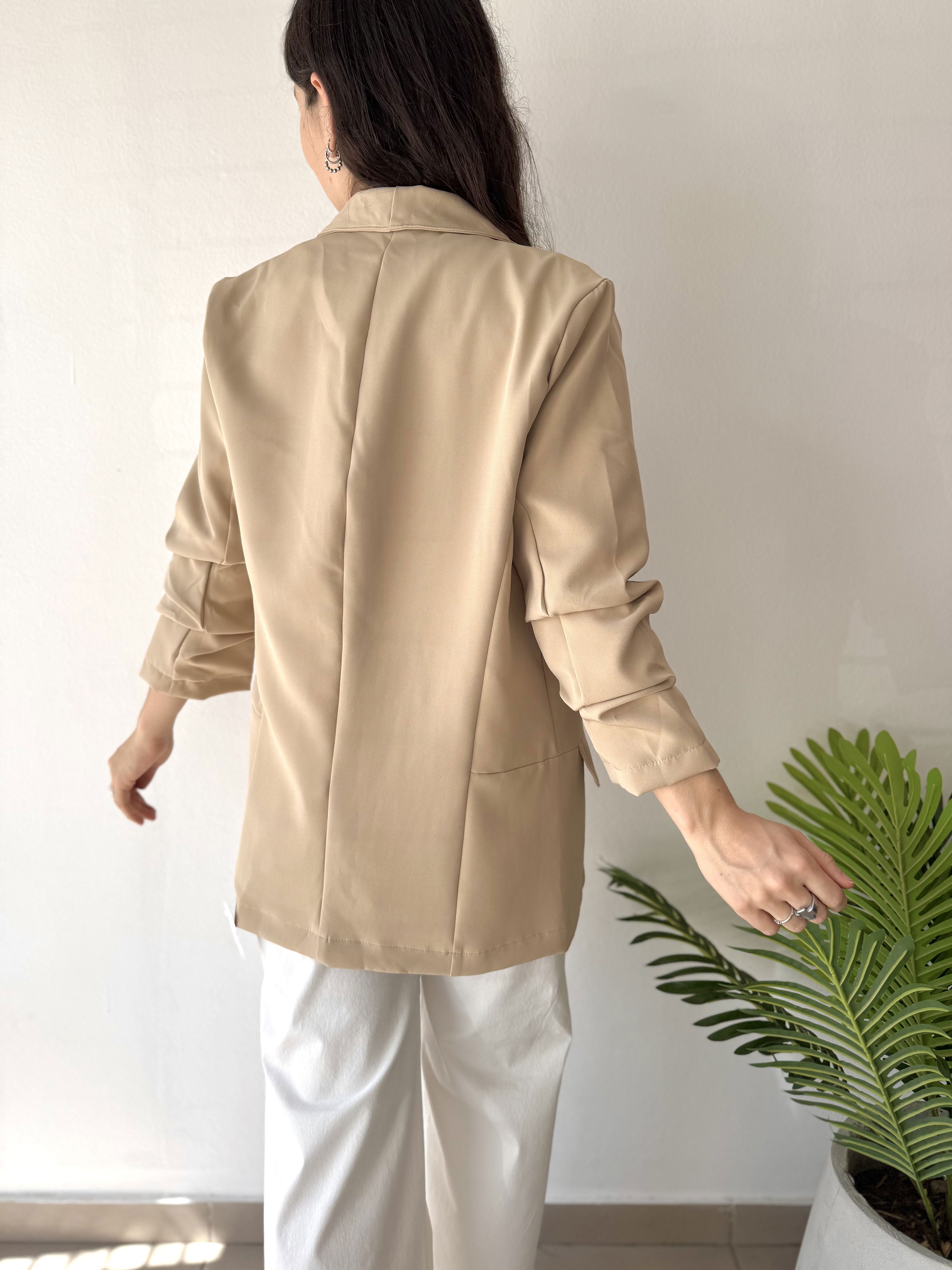 • Blazer de crepé, forrado en su interior, con solapas y bolsillos reales. Tiene el detalle de la manga arruchada, dando un efecto diferente y muy original.