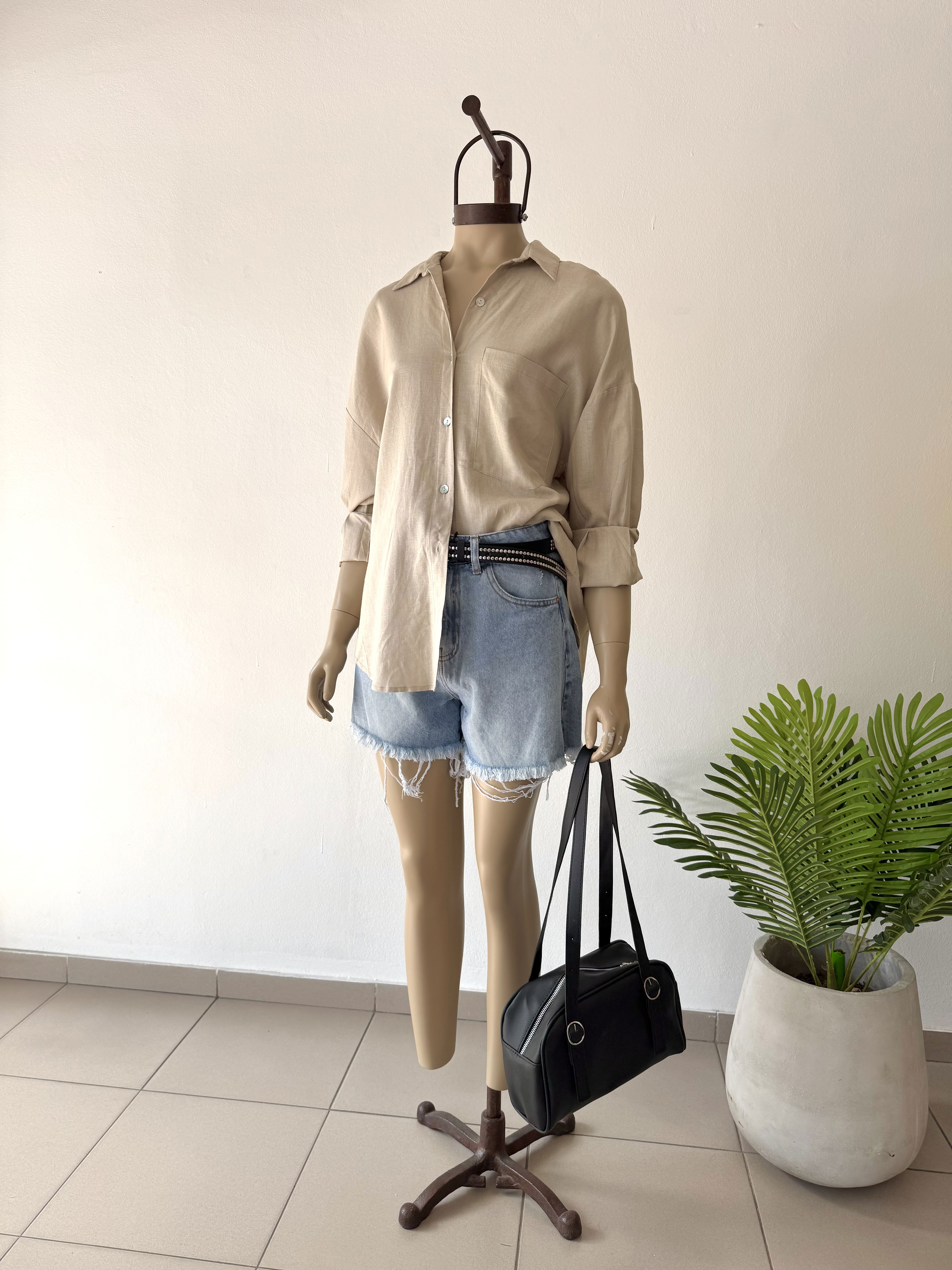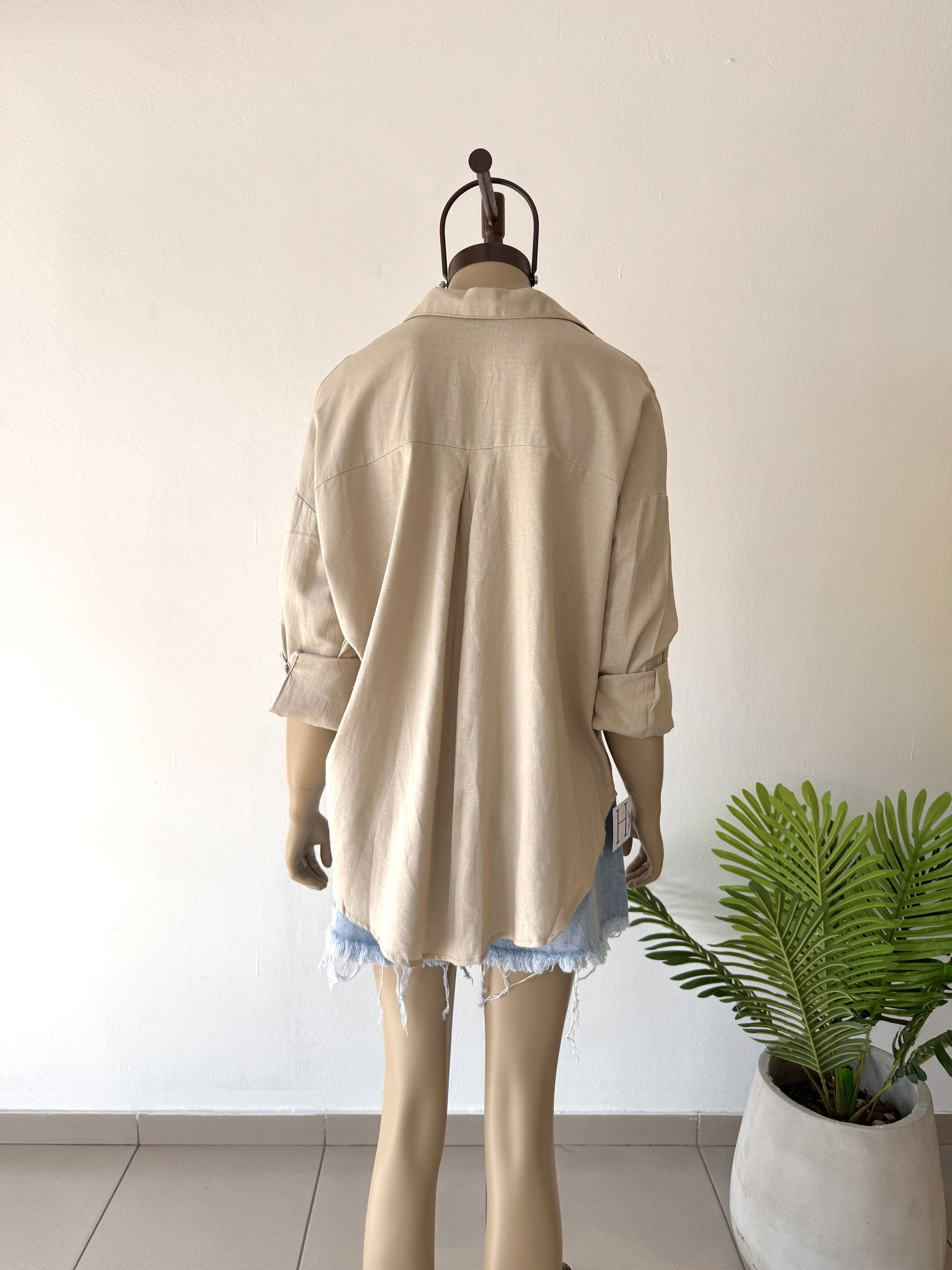 • Camisa de lino, con bolsillo en el frente y botones carey.