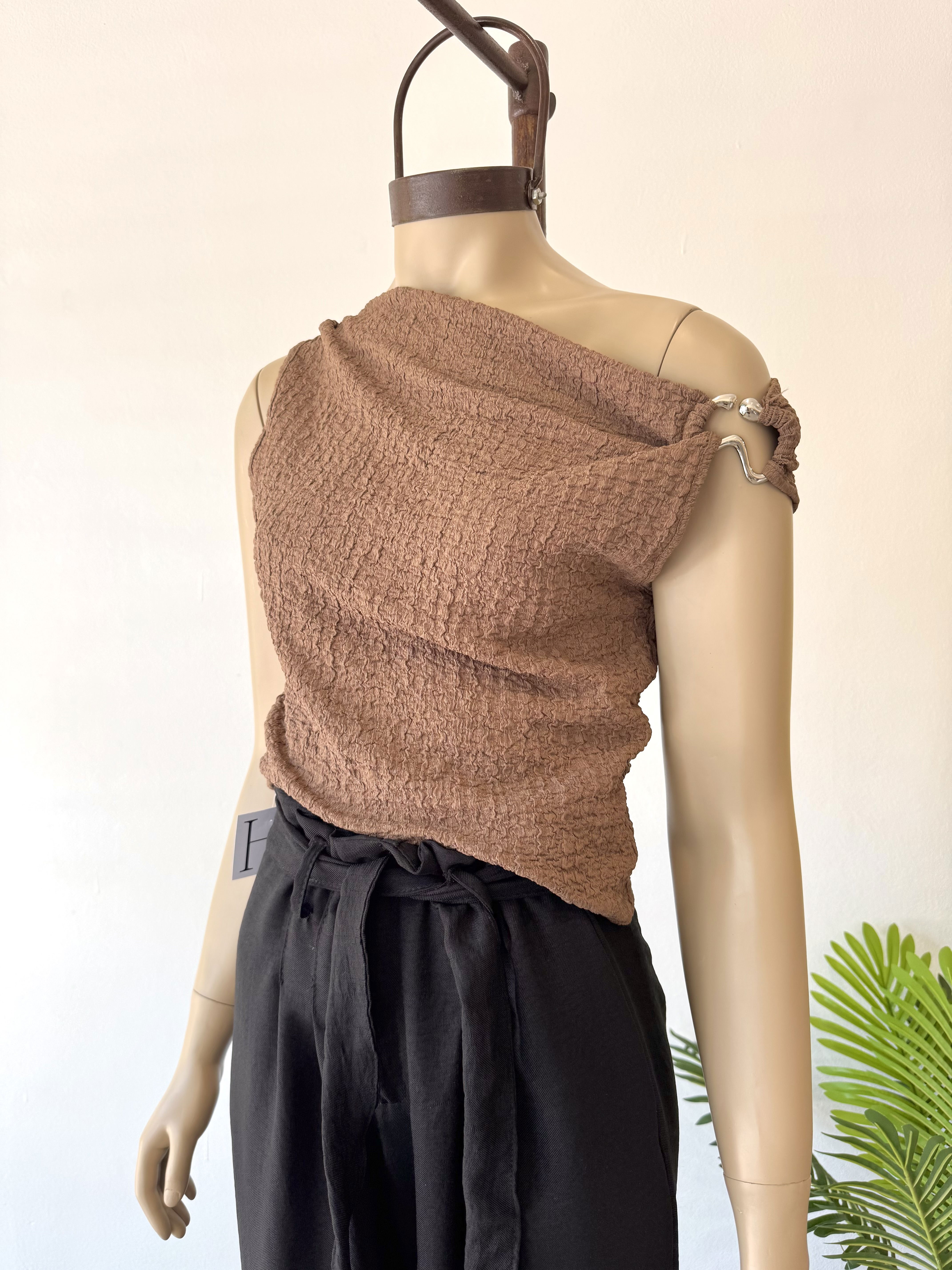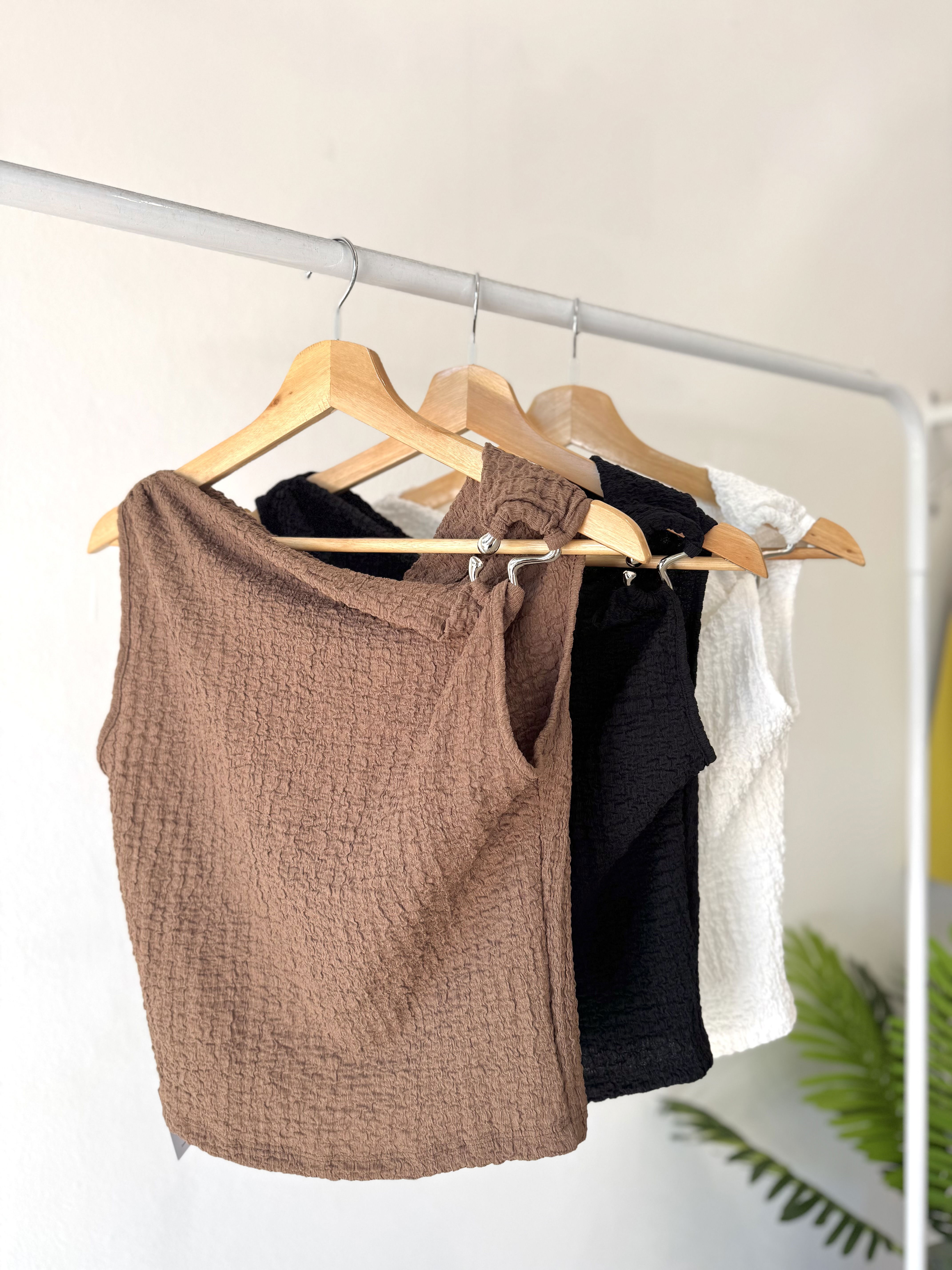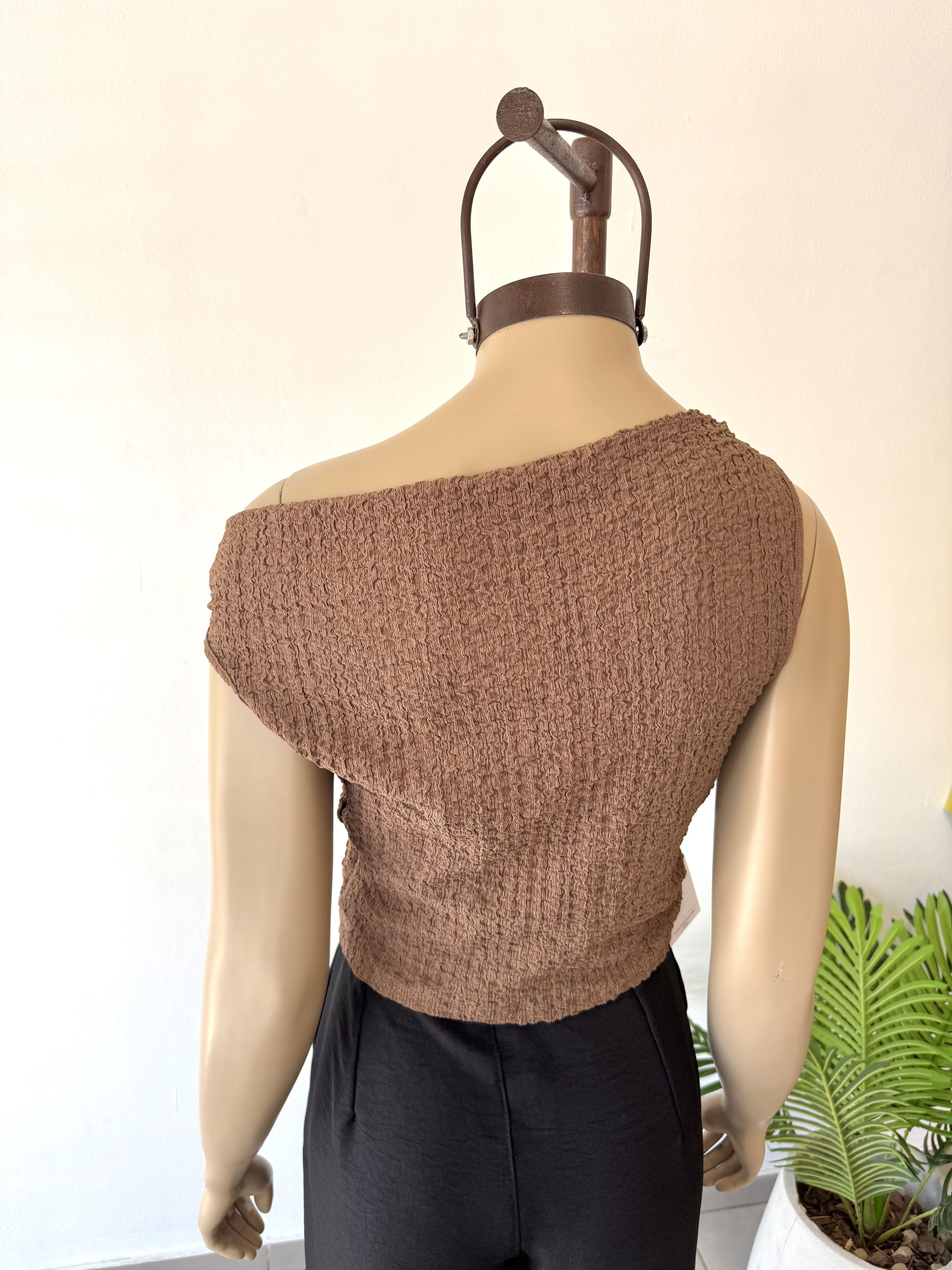 - Top de bambula con aplique en el hombro. Este modelo se puede usar con el hombro caído o con ambos lados arriba de los hombros, dando un efecto abuchonado.