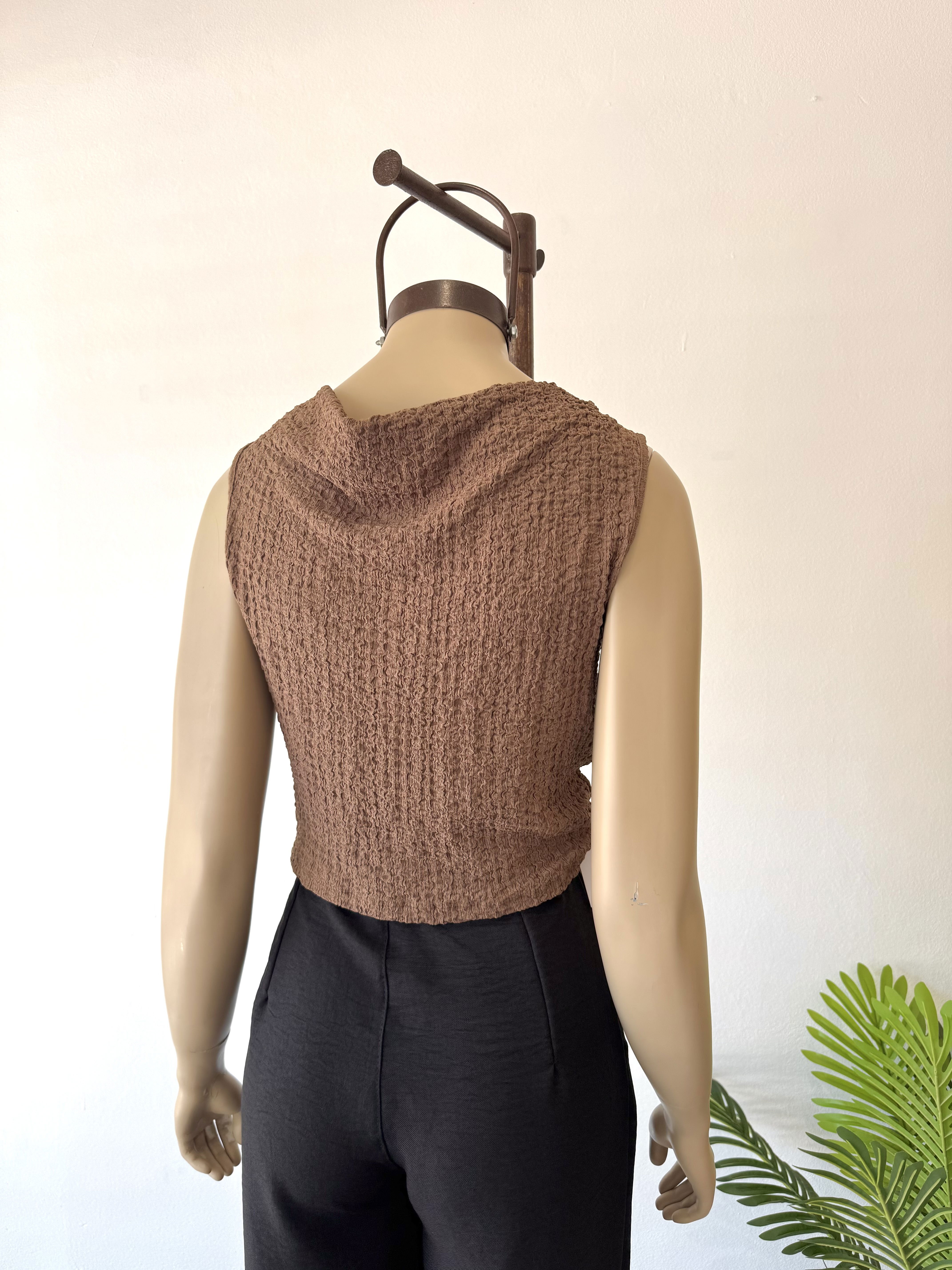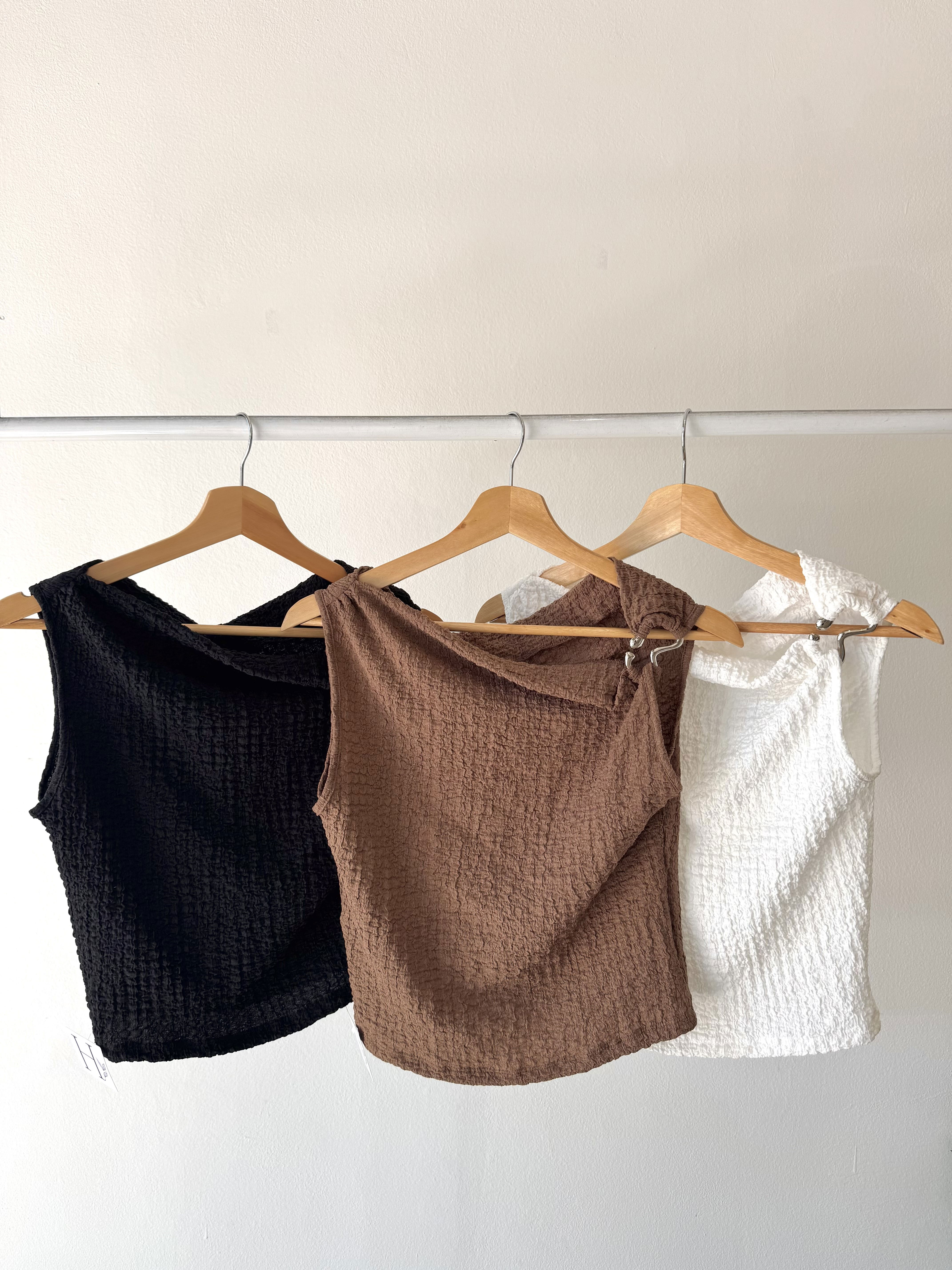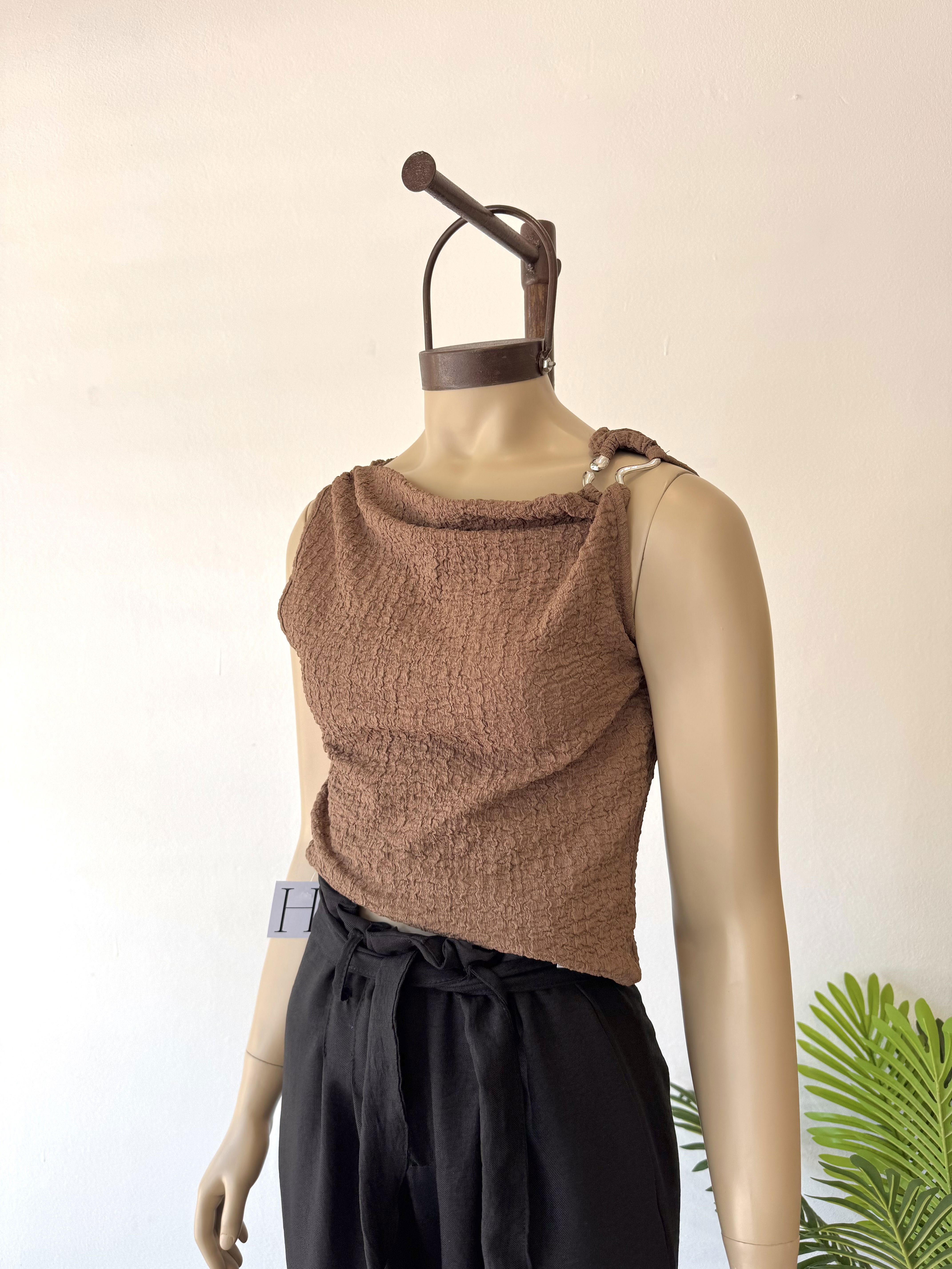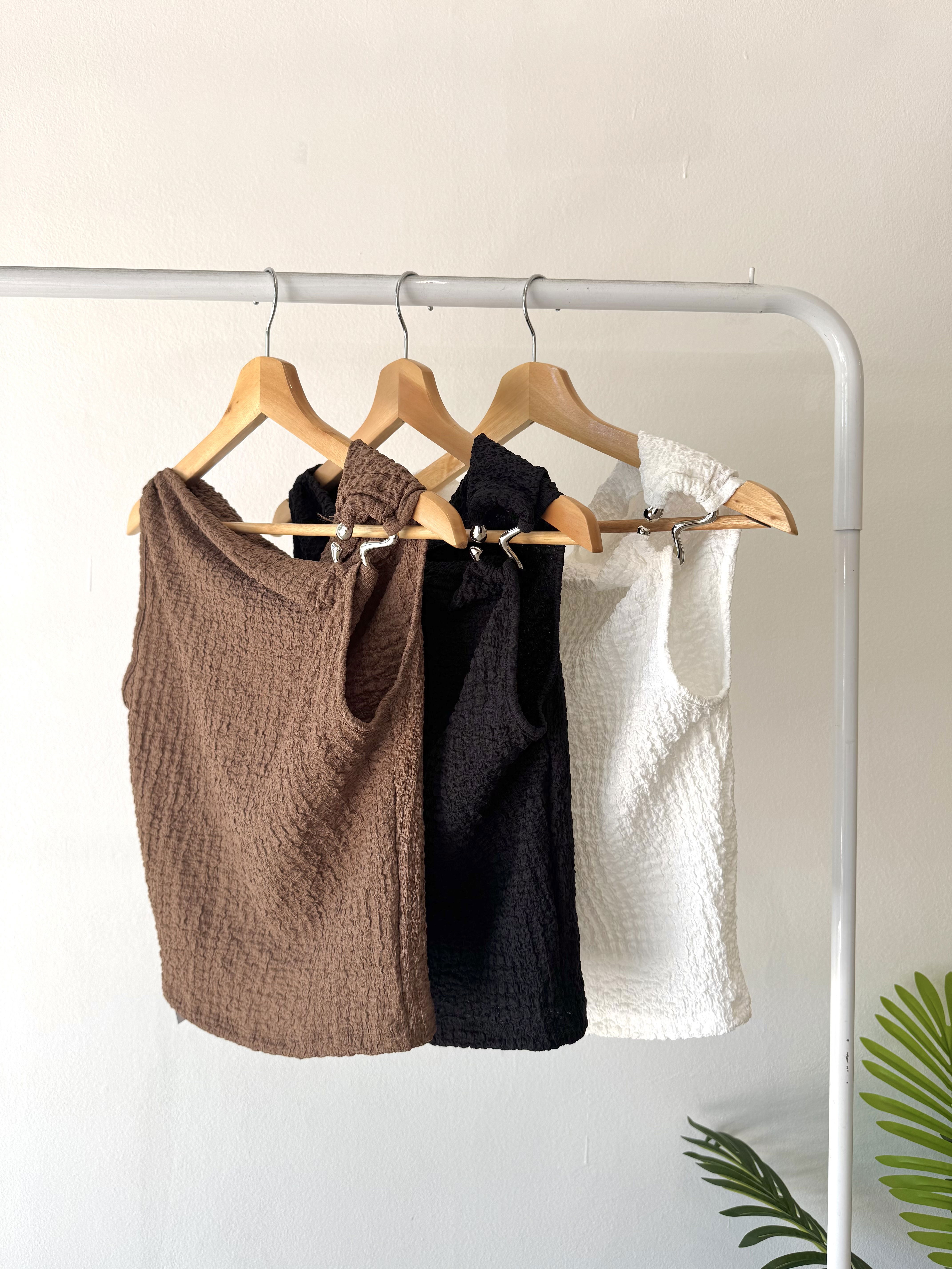 - Top de bambula con aplique en el hombro. Este modelo se puede usar con el hombro caído o con ambos lados arriba de los hombros, dando un efecto abuchonado.