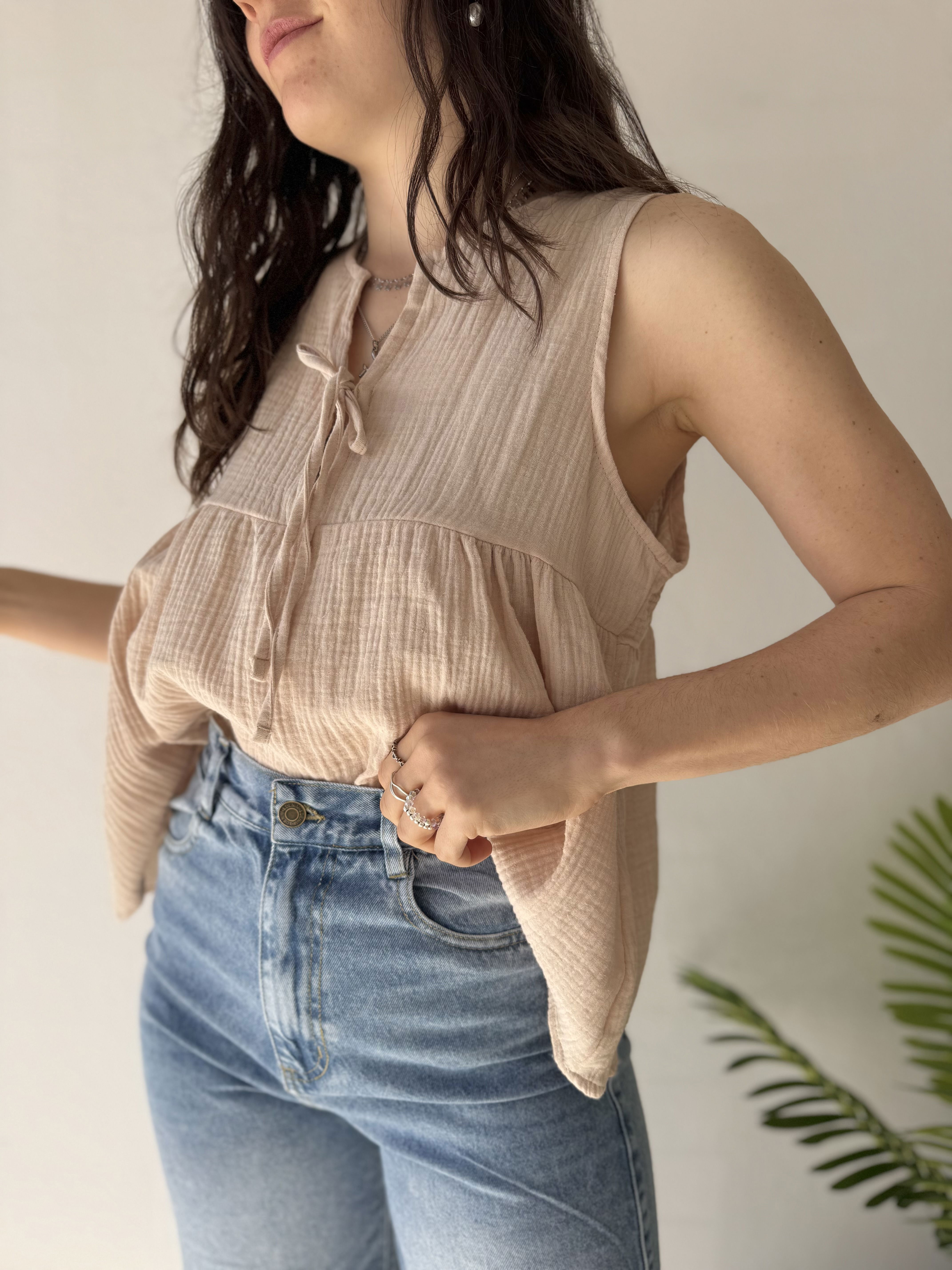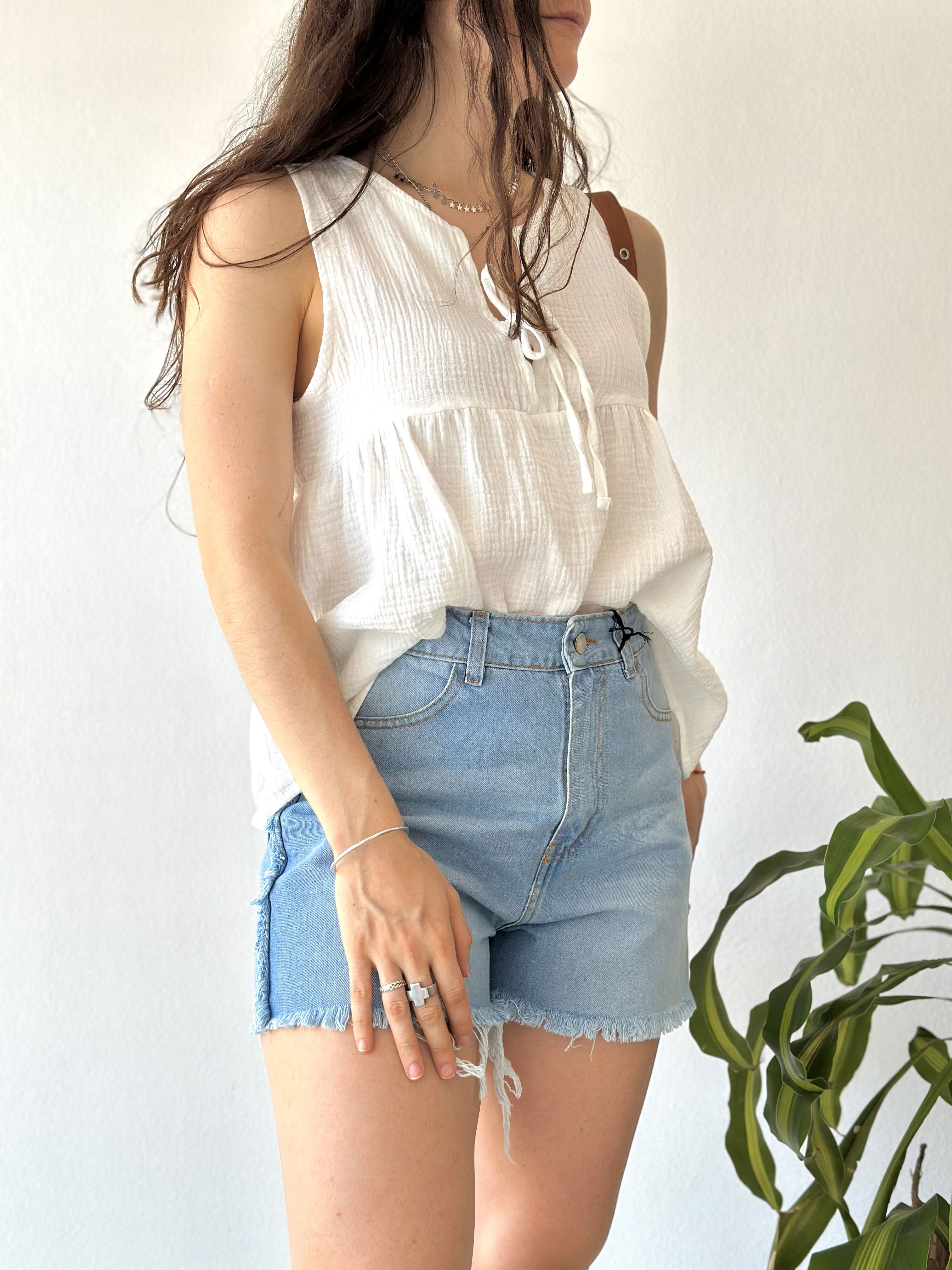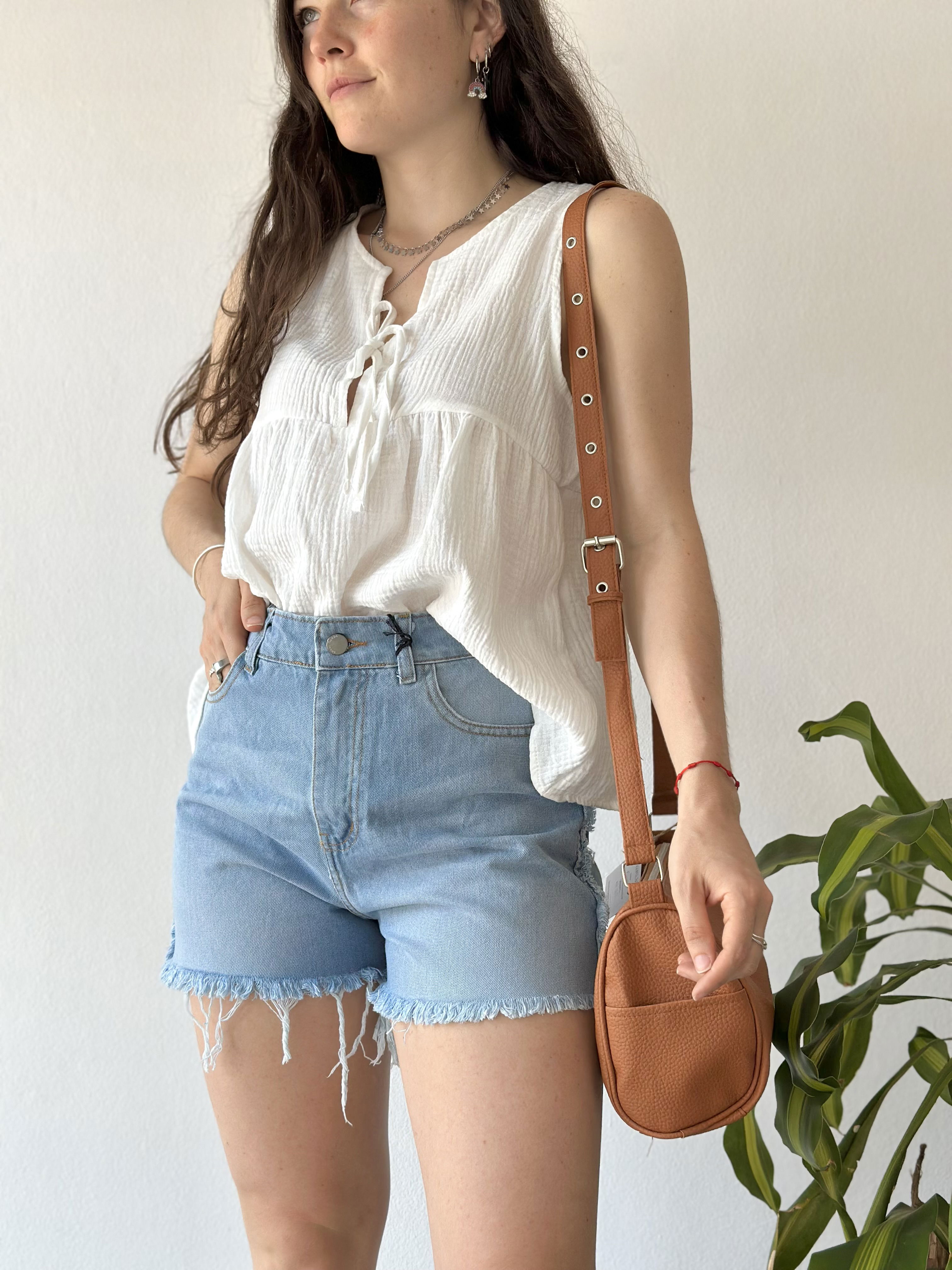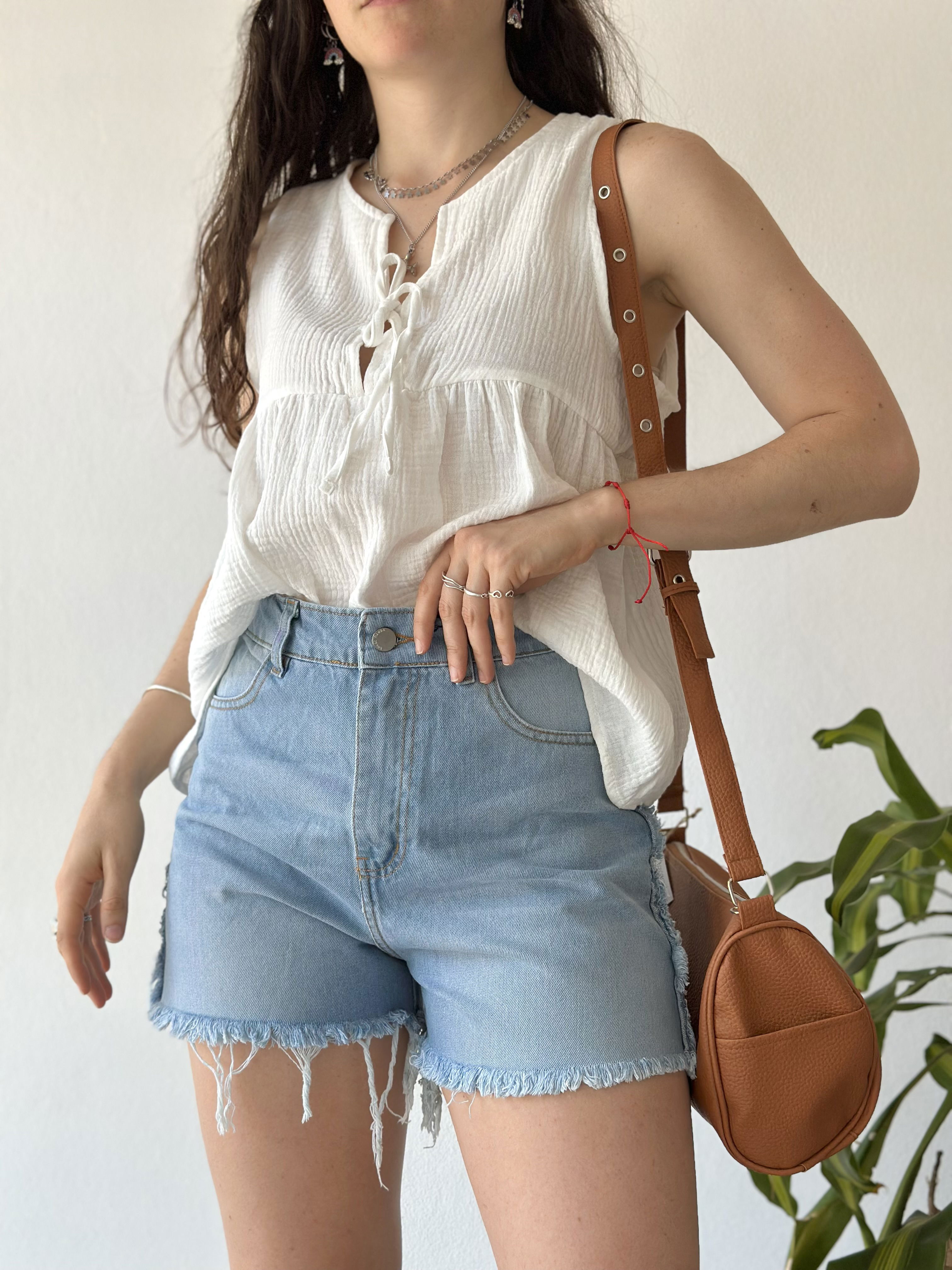 - Blusa de bambula con escote V y lazo para atar. Es una prenda muy cómoda que viste un montón.
