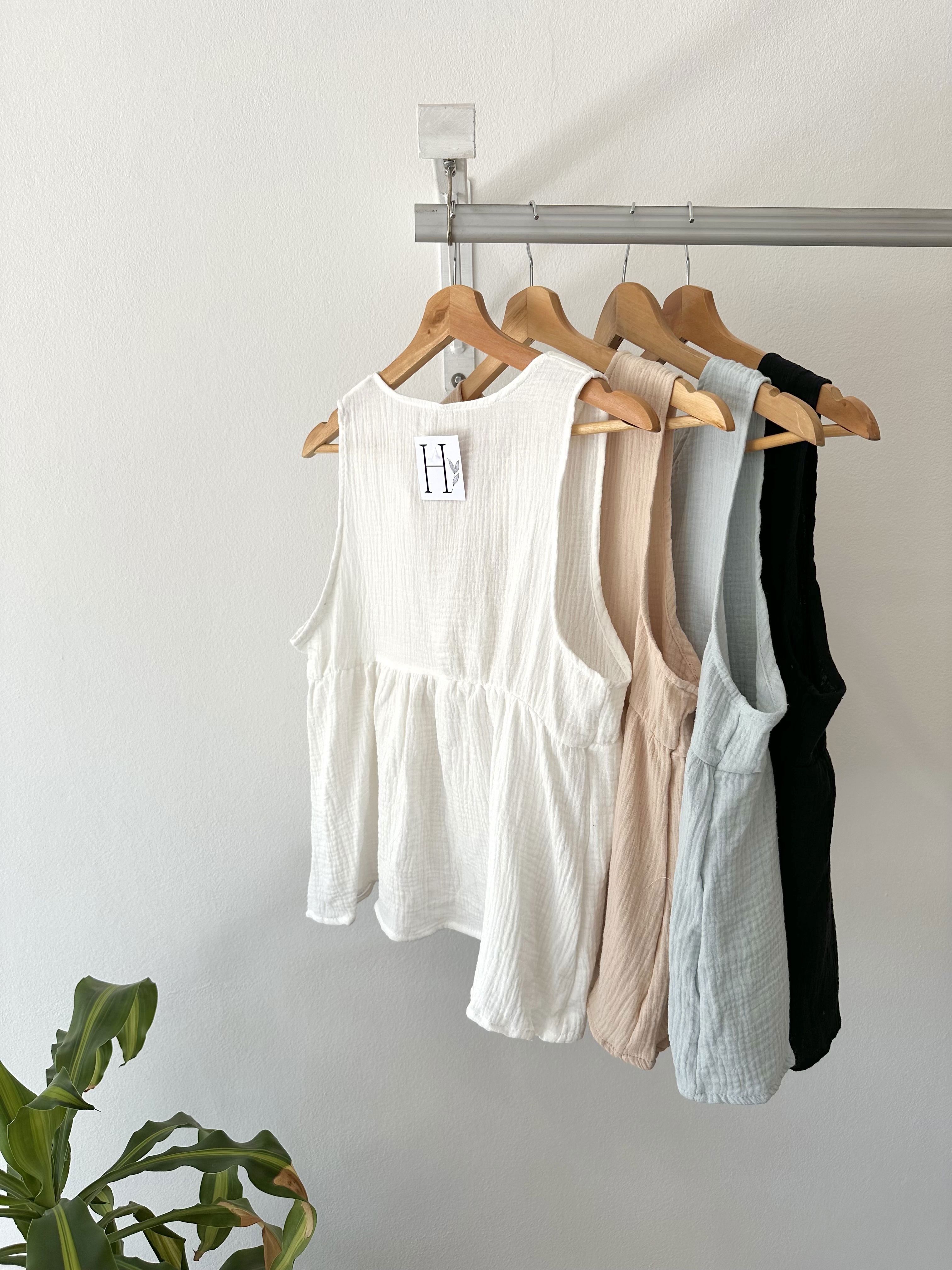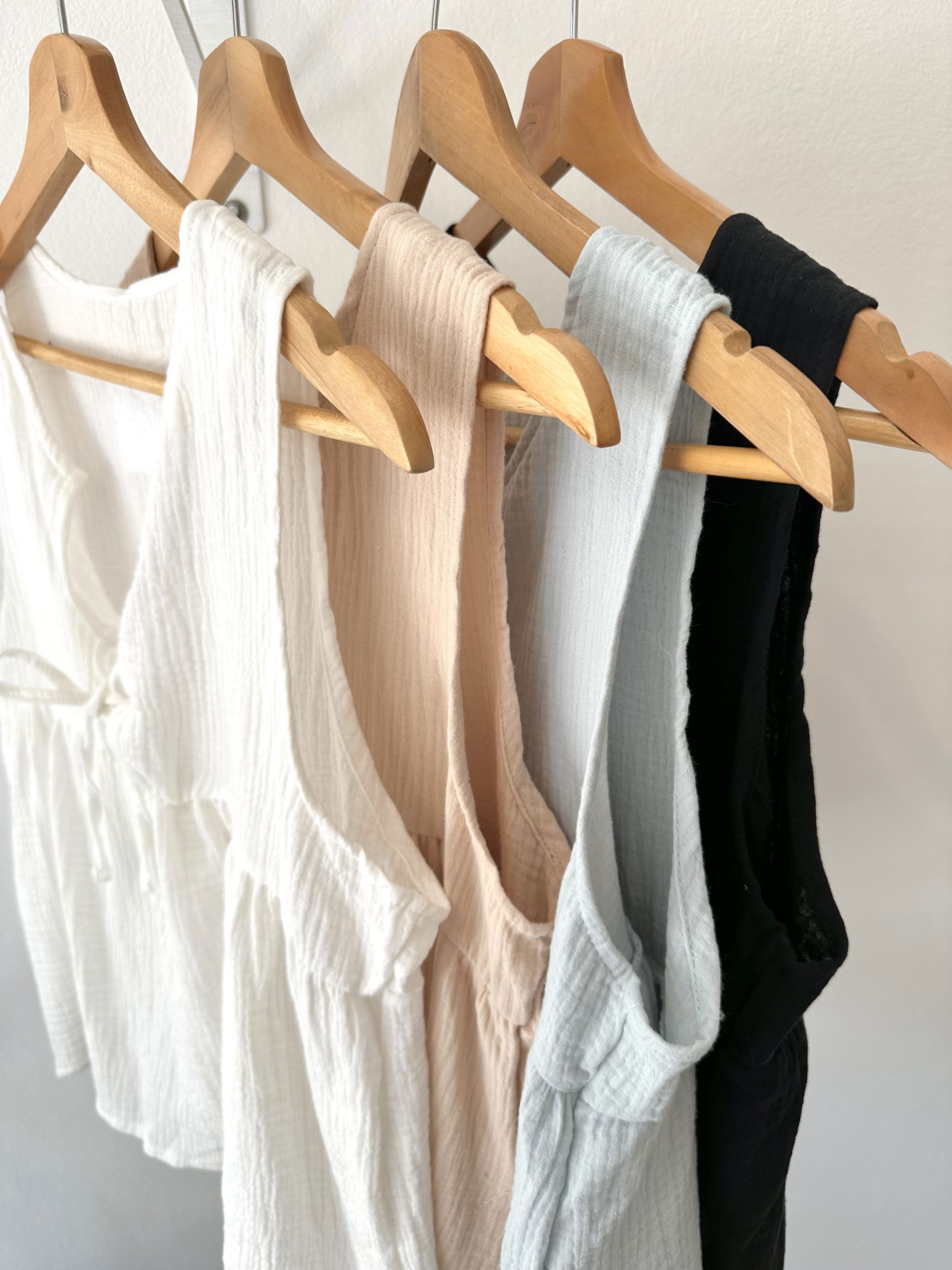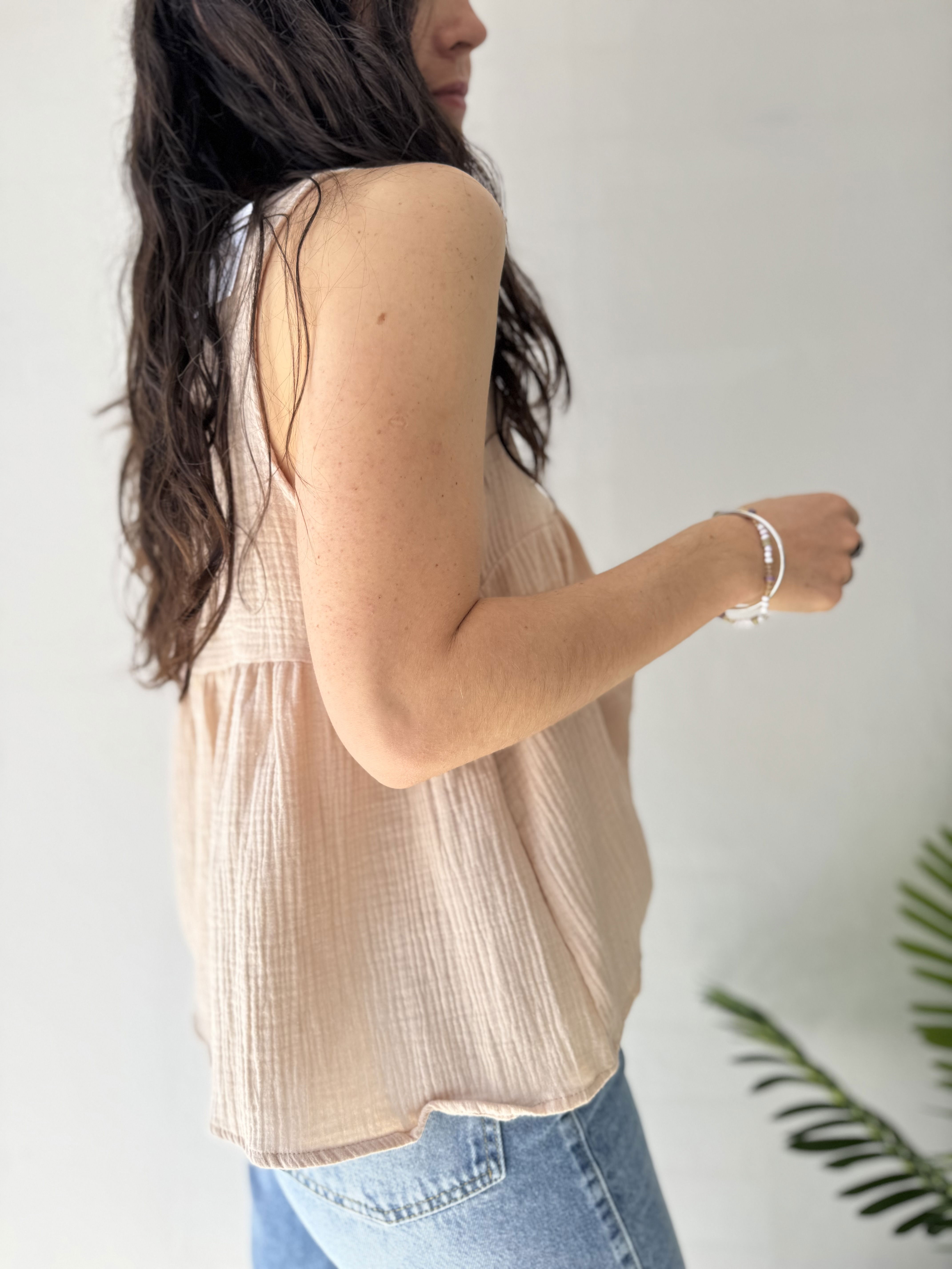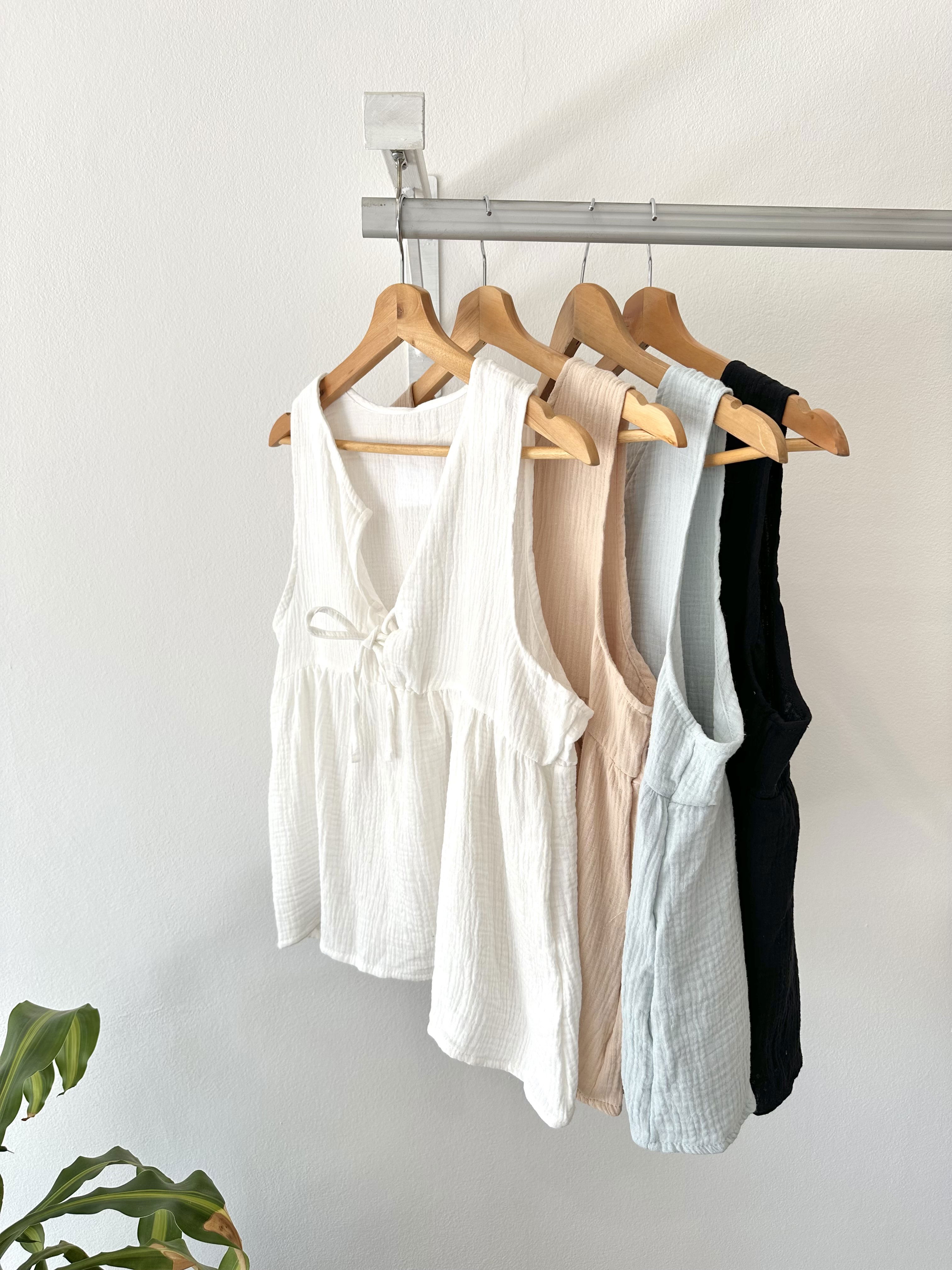 - Blusa de bambula con escote V y lazo para atar. Es una prenda muy cómoda que viste un montón.