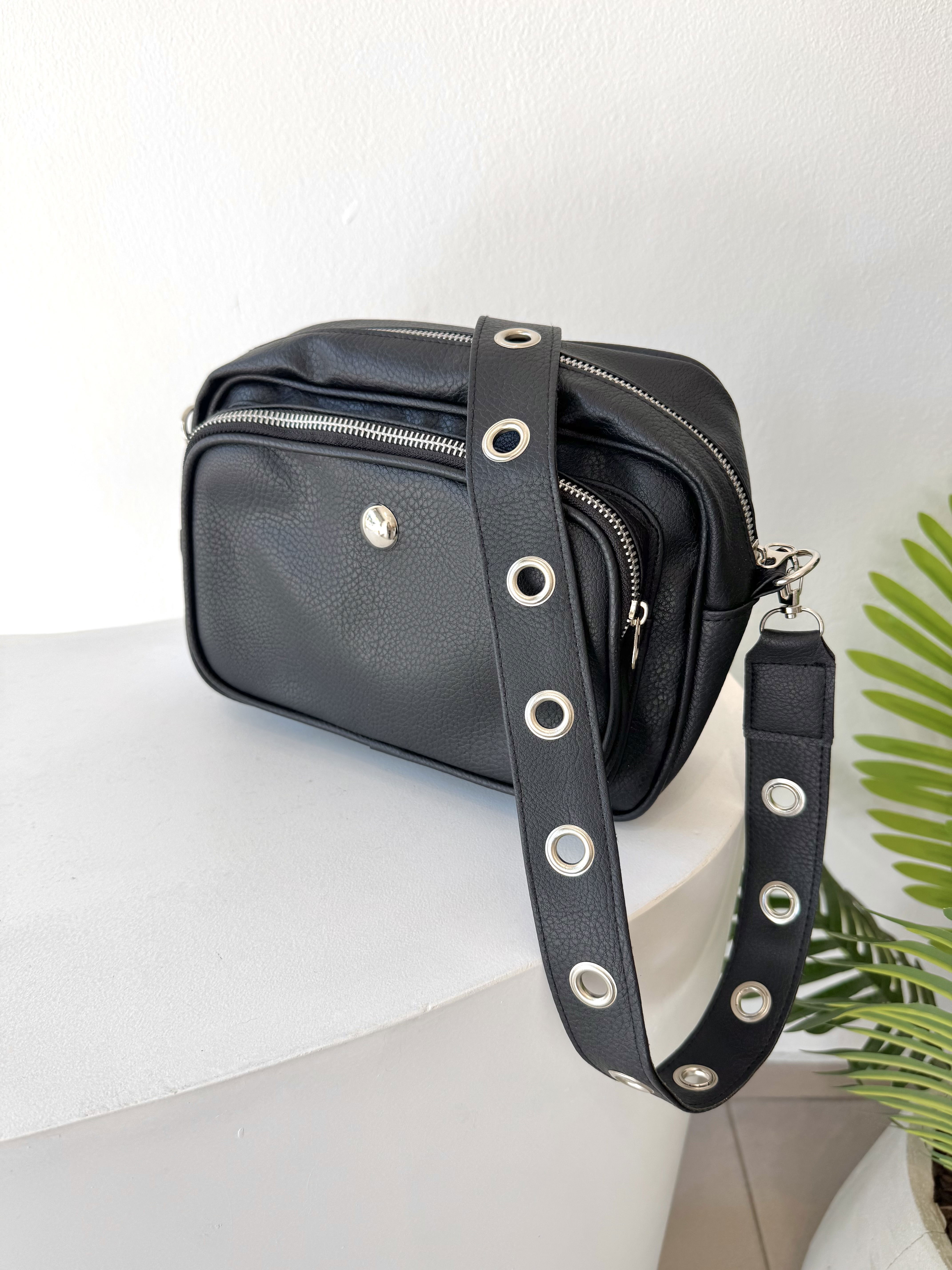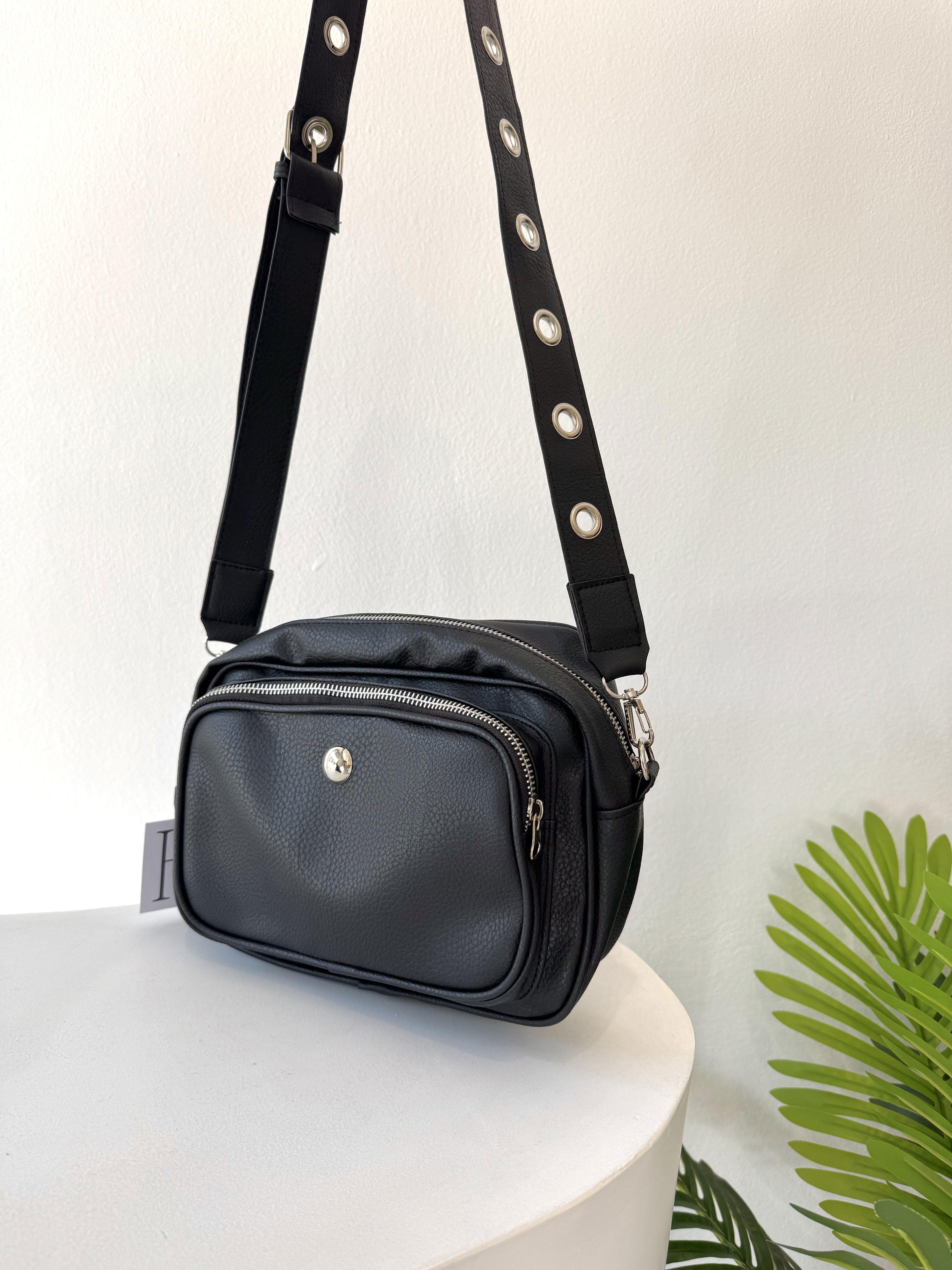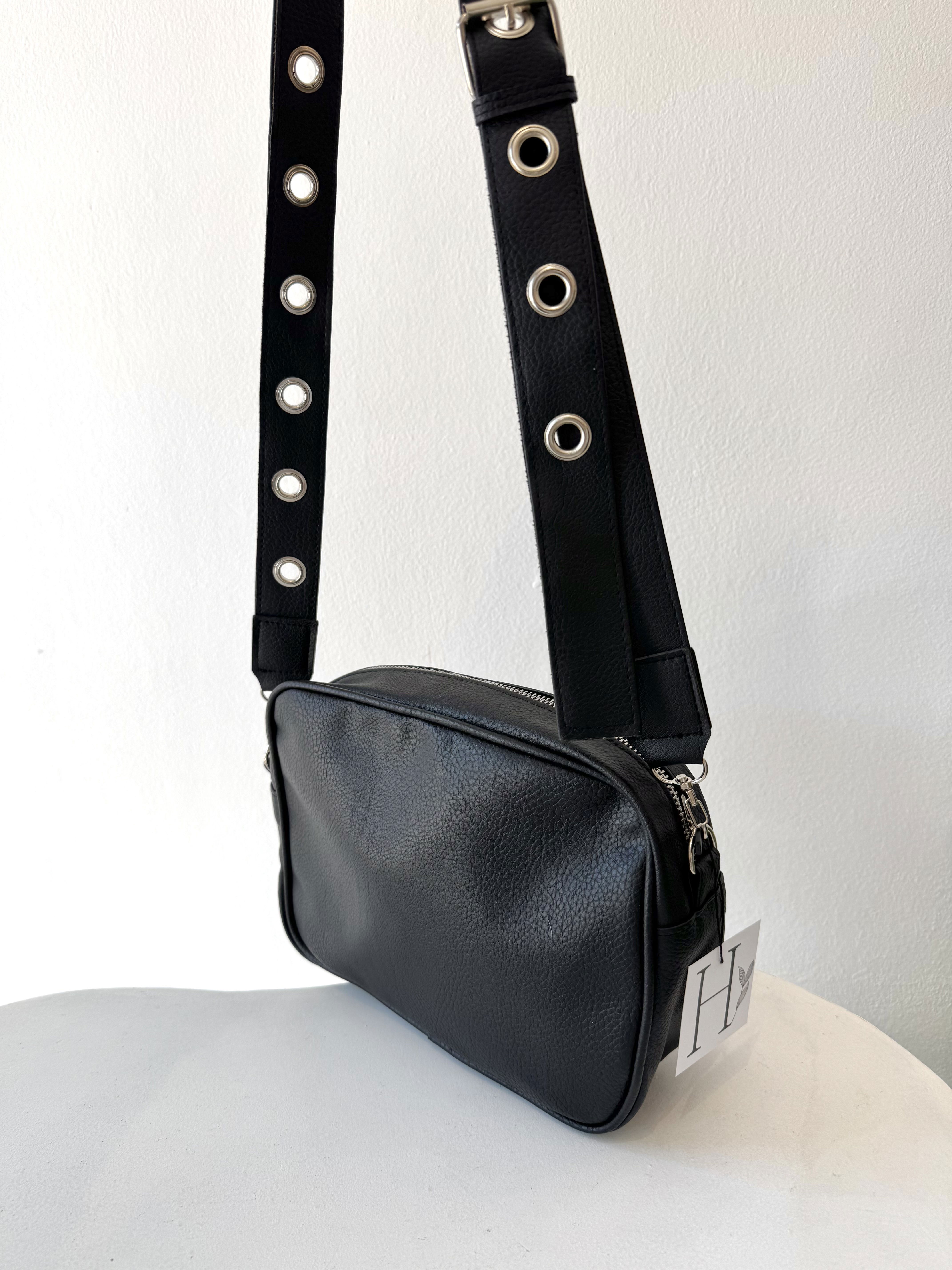 • Material: Ecocuero PU con forrería interna. Avíos metálicos, correa regulable y desmontable.