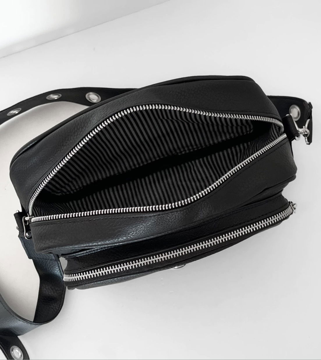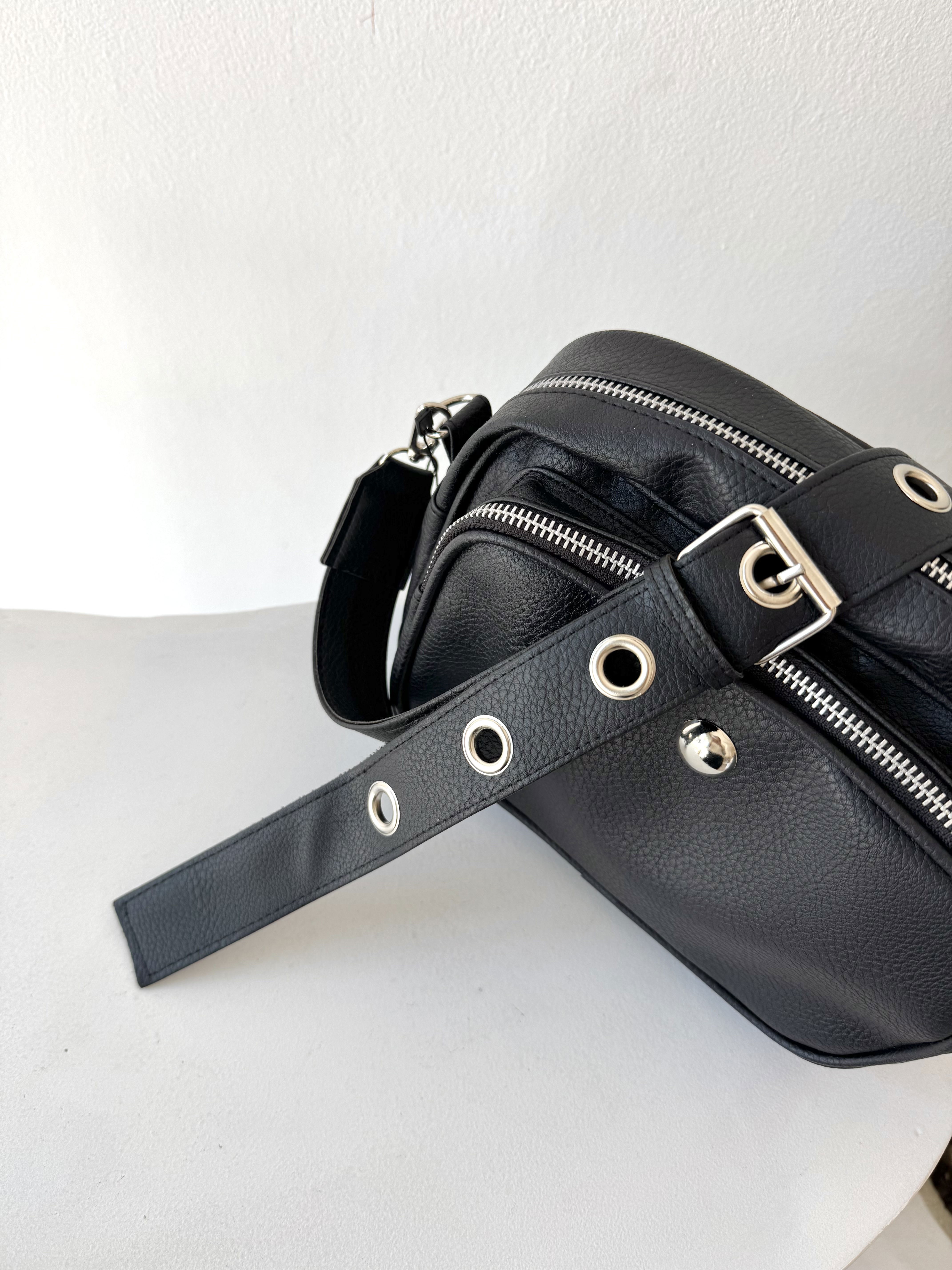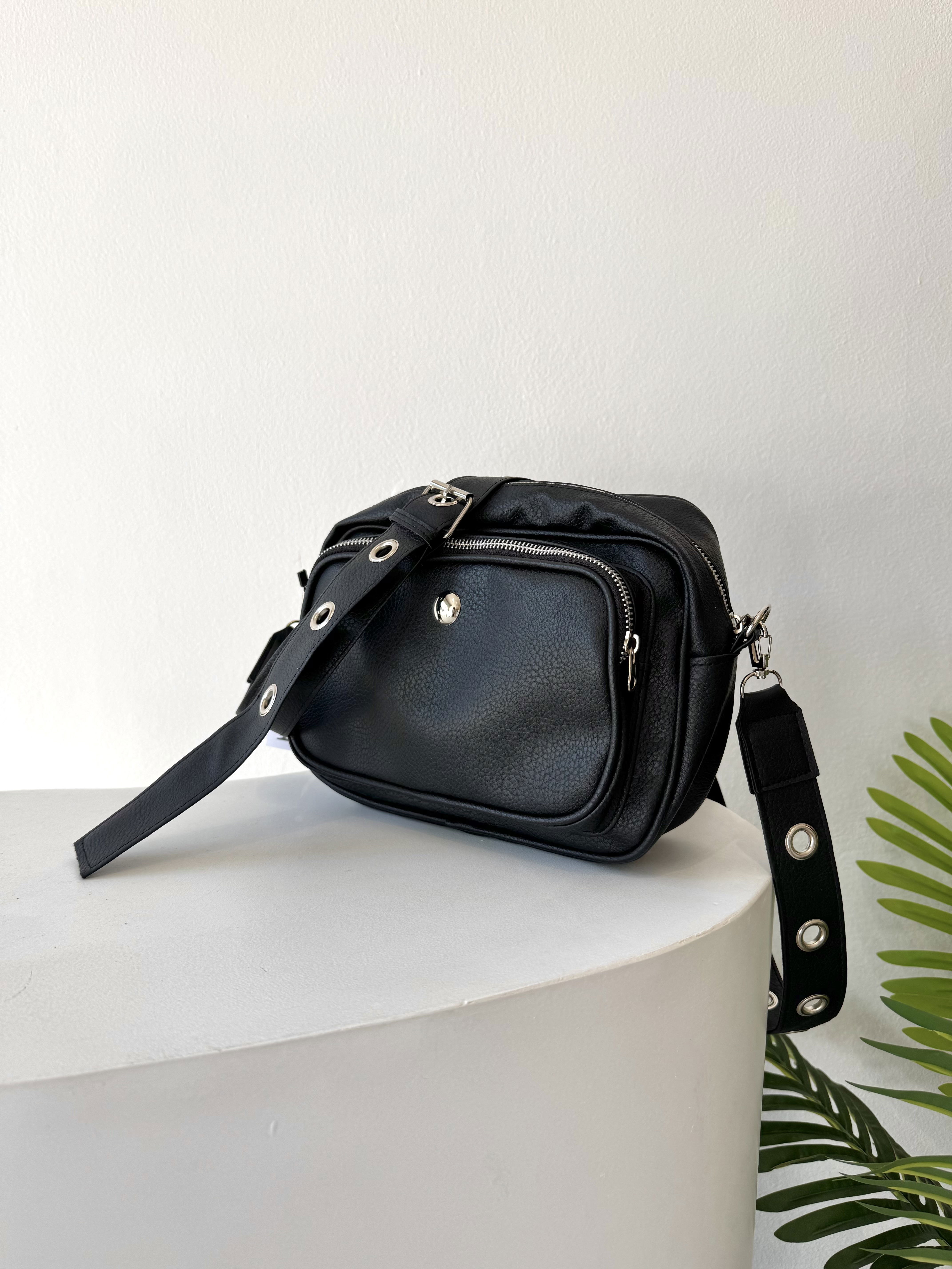 • Material: Ecocuero PU con forrería interna. Avíos metálicos, correa regulable y desmontable.